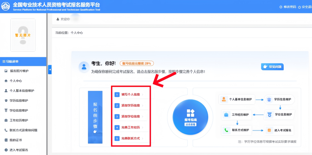 这一步就正式进入报名信息填写环节了,我把所有的报名信息分成三部分。(如果报考人员在步骤4便已完成信息填写,可以再检查下信息是否有误!)