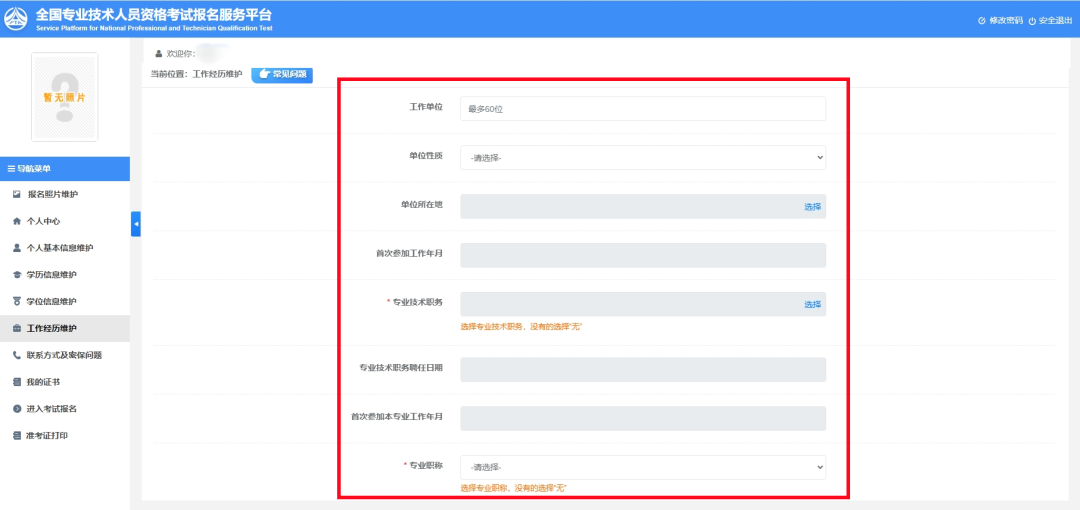 工作单位、工作性质、单位所在地、首次参加工作年月、专业技术职务、专业技术职务聘任日期、首次参加本专业工作年月、专业职称。
