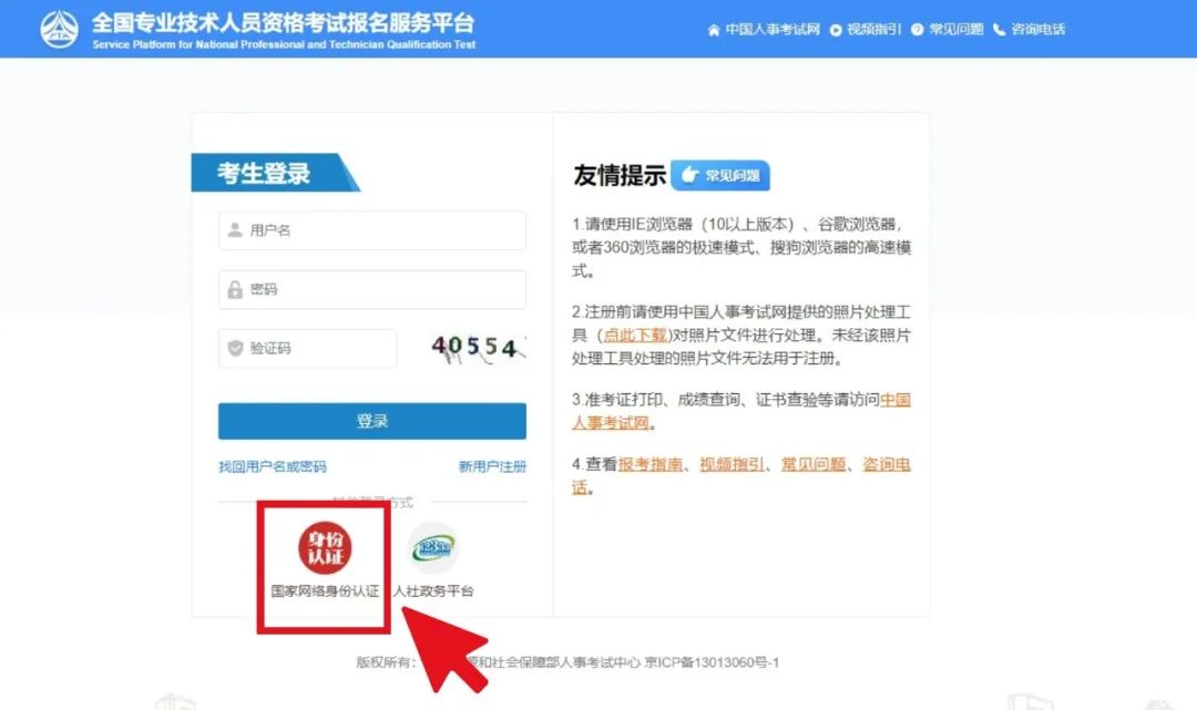 今年中国人事考试网报名系统新增了一个登录方式:使用“国家网络身份认证”扫码认证登录。