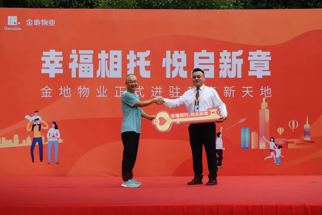 在热烈的掌声和广大业主的共同见证中,业主委员会胡主任将象征着小区管理权责与信任的 “金钥匙” ,正式递交给赣州一片区总经理曾招强。