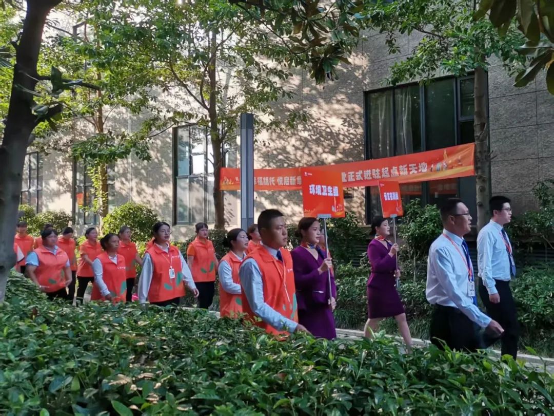 上午8时,晨光正好,金地物业团队身着统一制服,迈着整齐划一、铿锵有力的步伐正式入场!“精品服务 真情关爱”的服务口号声响彻小区,传递着团队坚定的信念与炽热的服务承诺。