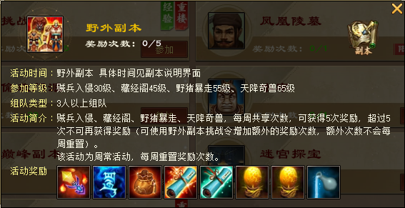 “野外副本”本意:贼兵人人都可以完成,藏经阁、野猪和天降奇兽有一定争夺性。