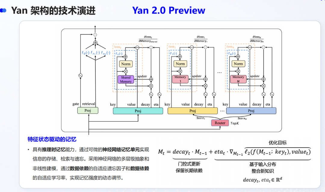 自主学习、多模态理解能力的提升,对Yan 2.0 Preview的底层架构创新提出了更高要求。Yan 2.0 Preview的核心在于,其通过可微的记忆模块来实现信息的存储、检索和遗忘,前向过程可分为记忆更新与记忆检索两个阶段。其中记忆更新过程,可以使模型通过门控式更新保留长期依赖,又能基于输入分布特性灵活整合新知识,记忆检索过程可以在增大模型记忆容量的同时,增强其检索能力。在自主学习的基础上,该模型还具备对不同模态数据的理解、生成能力,其核心组件包括基于Yan 2.0 Preview架构的语言模型、视觉编码器、视频tokens压缩模块、视觉连接层、音频离散化模块和音频解码器。其中,音频离散化模块通过将连续的语音信号量化至有限的离散值集合,提高音频样本的建模效率,可以做到低比特率实现统一建模语音的语义和声音信息。音频模态能力扩展方面,Yan架构多模态模型能够有效地学习音频序列并建模细节声学特征,其采用约100万小时音频数据进行音频模态扩充与对齐训练,800万对语音问答数据供音频问答任务的有监督微调。最后音频解码阶段,音频解码器负责将Yan架构多模态模型生成的离散音频Token解码为最终的音频波形,实现高质量的端到端语音合成。可以看出,Yan 2.0 Preview在多模态能力的各项底层架构创新上,都在不断突破降低计算资源、提高模型性能的边界。这些背后都是RockAI在非Transformer这条道路上坚持的结果,与当下端侧模型部署的核心需求相契合。如今,RockAI的Yan系列模型已经落地某品牌PC,并实现了集成大模型能力的会议助手等多项功能。