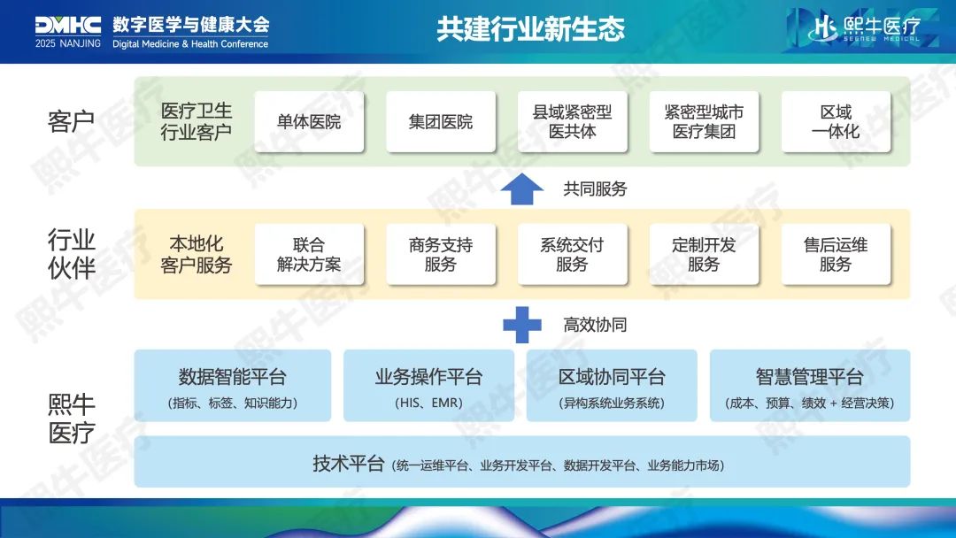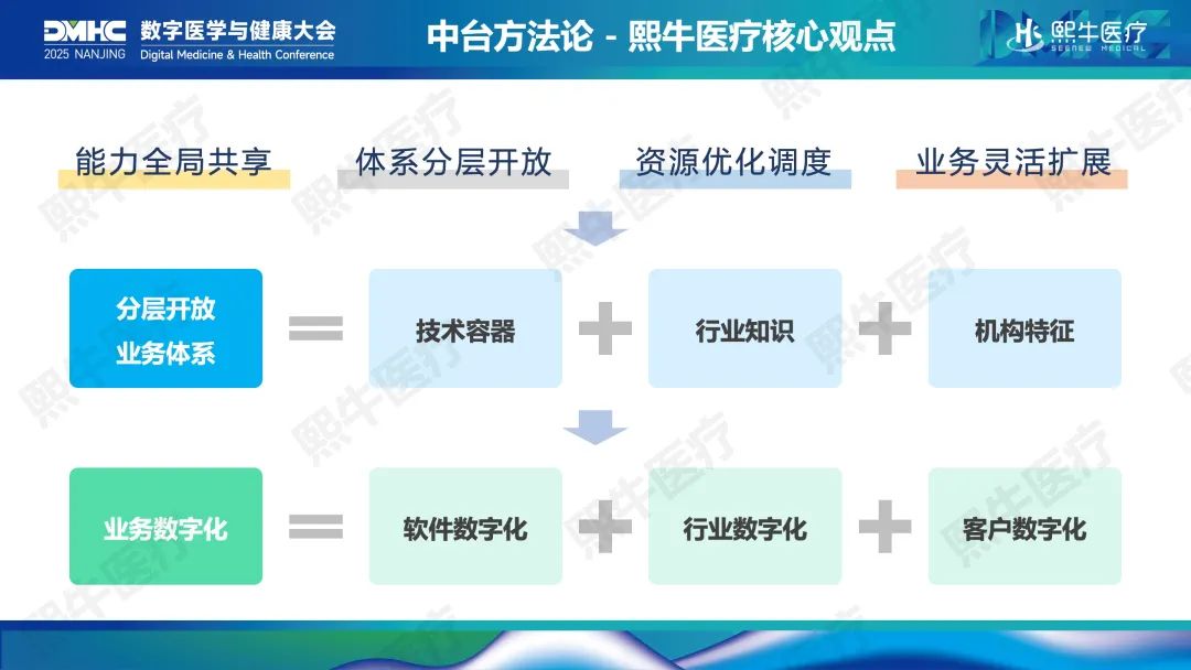 熙牛医疗将核心业务系统划分为技术容器、行业知识和机构特征三个层次。其中,技术容器层是熙牛医疗基于云原生架构设计并自主研发的通用技术底座,支持大规模复杂业务系统的高效稳定运行;行业知识层则归纳了可复用的医疗业务逻辑和共享的行业知识,供各类医疗机构共享使用;机构特征层通过识别不同医院、院区及业务单元的个性化需求,实现个性化业务的独立演进与并行管理。