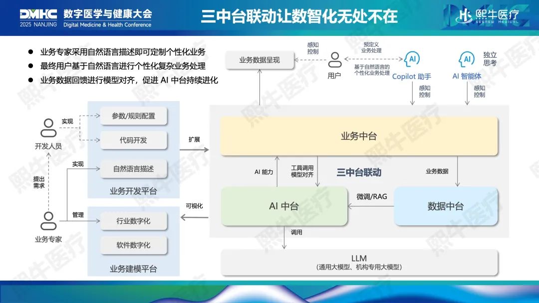 方贤介绍,熙牛医疗已实现了让业务专家以自然语言形式输入需求,由系统自动解析并调整业务运行逻辑。未来,医护人员也将能够通过自然语言指令直接完成复杂业务操作。“三中台联动”将基于预设规则和流程的传统业务系统,转变为面向数据、支持实时动态规划与决策的新一代数字化系统。