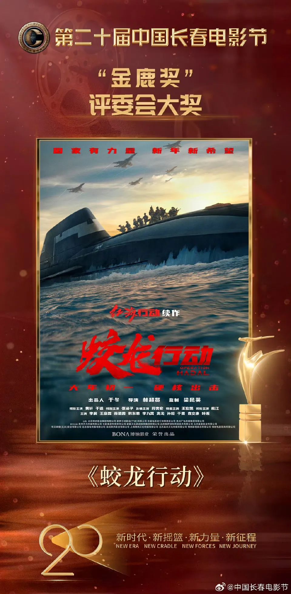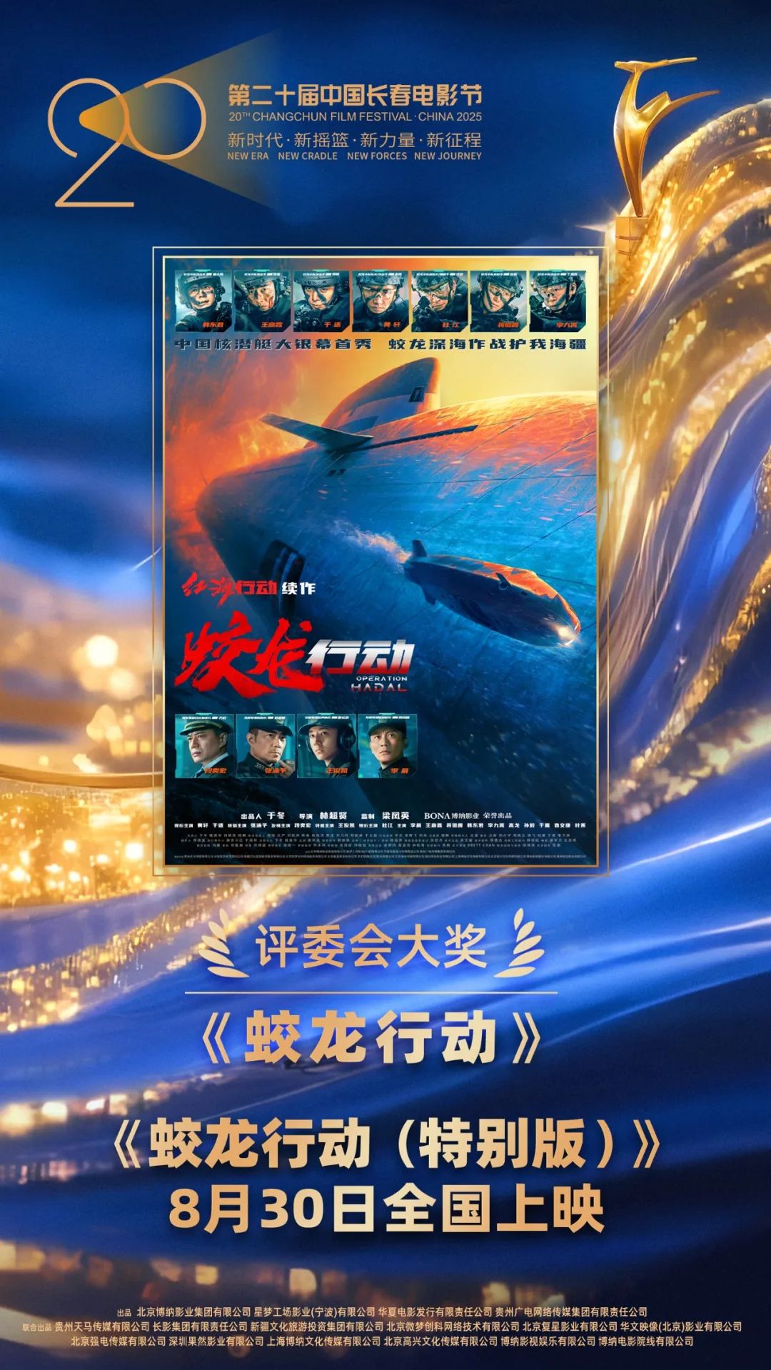2025年8月28日,第20届中国长春电影节闭幕式暨“金鹿奖”颁奖典礼隆重举行。由博纳影业荣誉出品、著名导演林超贤执导的军事动作大片《蛟龙行动》摘得评委会大奖。影片凭借其震撼的视听效果、紧凑的叙事节奏和深刻的思想内涵,赢得了评委和观众的一致好评,成为本届电影节最受瞩目的作品之一。《蛟龙行动》是博纳影业携手林超贤导演继《红海行动》后,七年磨一剑推出的又一力作。从《红海行动》到《蛟龙行动》,主创团队用7年时间续写“蛟龙精神”,拍摄过程中的每一份付出,都为这部深海巨制注入了真实的力量。《蛟龙行动》不仅在技术上取得了突破,在思想内涵上也获得了高度认可。据2025年春节档中国电影观众满意度调查结果显示,该片思想性指标得分高达84.9分,与《熊出没·重启未来》并列档期第二位。著名演员陈宝国、斯琴高娃,著名导演李少红(从左至右)为评委会大奖开奖博纳影业董事长、《蛟龙行动》总制片人于冬携手联合出品方、长影集团董事长庄严共同领奖。于冬发表获奖感言:“感谢长春电影节,感谢评委,将此殊荣颁给《蛟龙行动》。博纳影业曾经出品过的《长津湖》《长津湖之水门桥》,都是在这个颁奖台上获得过最佳影片,感谢长影集团对博纳影业一如既往的支持和鼎力相助。感谢所有台前幕后的工作人员,感谢林超贤导演,感谢我们所有的演员。即将于8月30日上映的《蛟龙行动特别版》,是弥补我们在春节档期的遗憾,希望不留遗憾地上映。特别是在即将到来的大阅兵前夕,能够为祖国献上一份厚礼,致敬中国人民解放军,人民海军。谢谢广大观众再给《蛟龙行动》一次机会。”即将于8月30日全国上映的《蛟龙行动特别版》经过半年打磨,对剧情节奏进行了精细化调整,并采用48帧高帧率技术,优化了深海战场的视觉效果,提供了更多快速镜头的细节,使画面更流畅。长春电影节的肯定为这部佳作增添了新的光环。金鹿奖的评委会大奖不仅认可了《蛟龙行动》的艺术成就,更彰显了中国电影工业的成熟与进步。电影《蛟龙行动》由北京博纳影业集团有限公司、星梦工场影业(宁波)有限公司、华夏电影发行有限责任公司、贵州广电网络传媒集团有限责任公司出品,贵州天马传媒有限公司、长影集团有限责任公司、新疆文化旅游投资集团有限公司、北京微梦创科网络技术有限公司、北京复星影业有限公司、华文映像(北京)影业有限公司等联合出品。最佳影片奖:《南京照相馆》