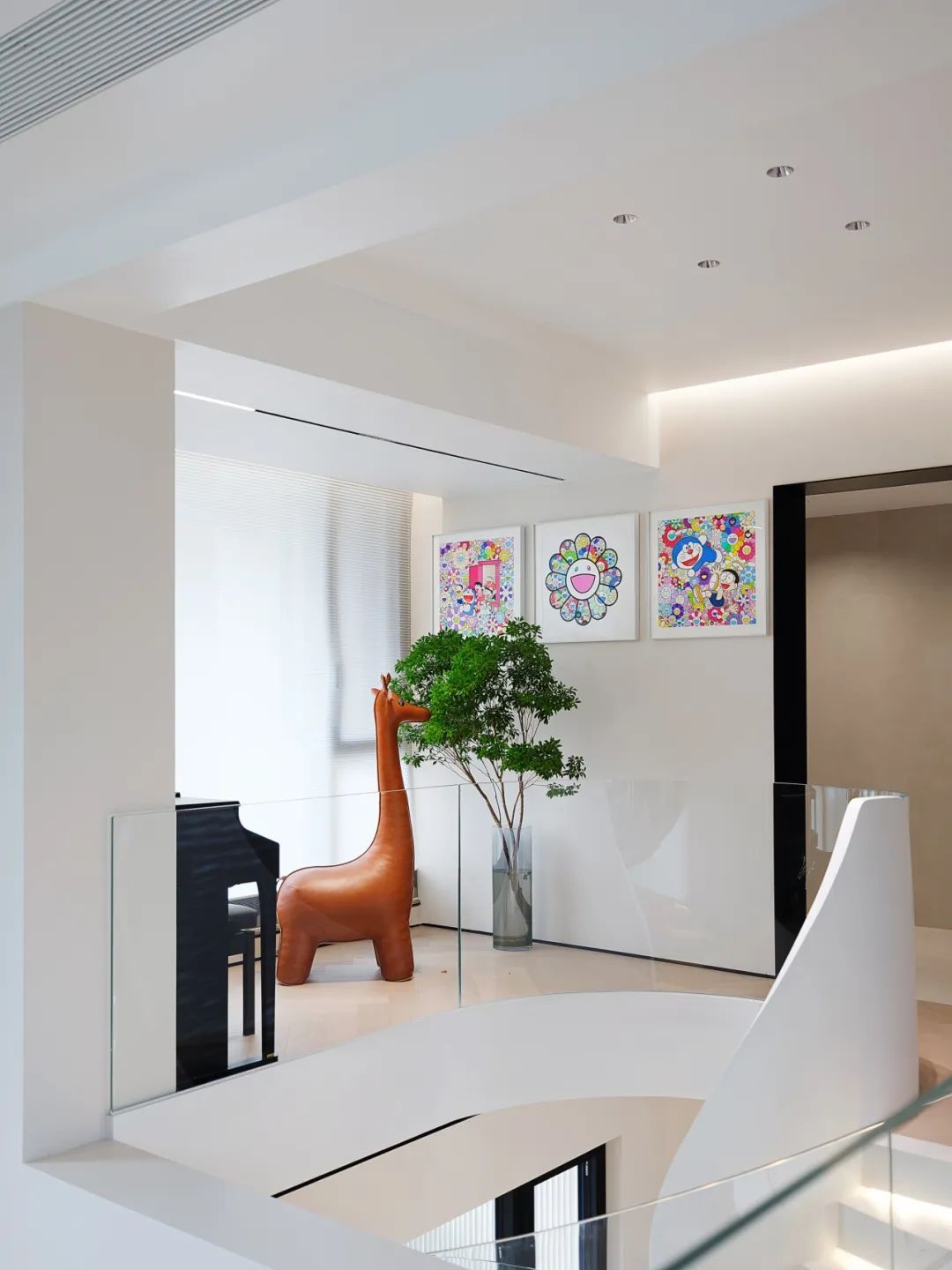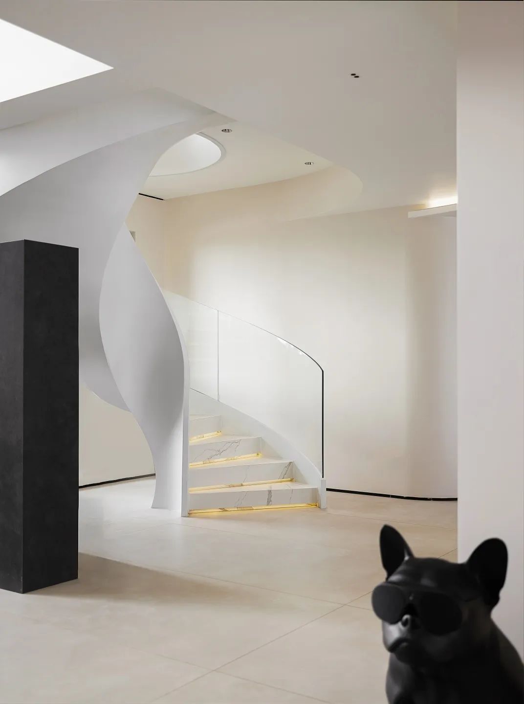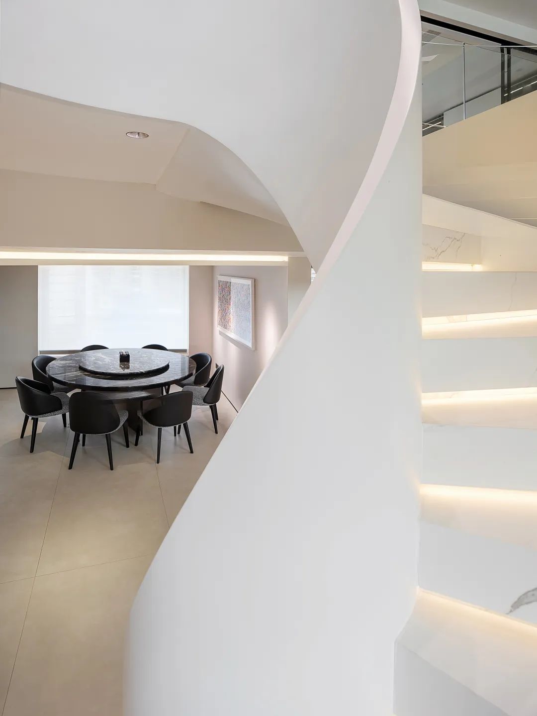 旋转楼梯作为连接上下层的过渡空间,采用透明玻璃扶手和纯白踏步设计,宛如一件精致的艺术装置。