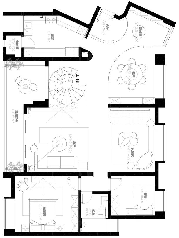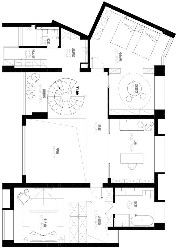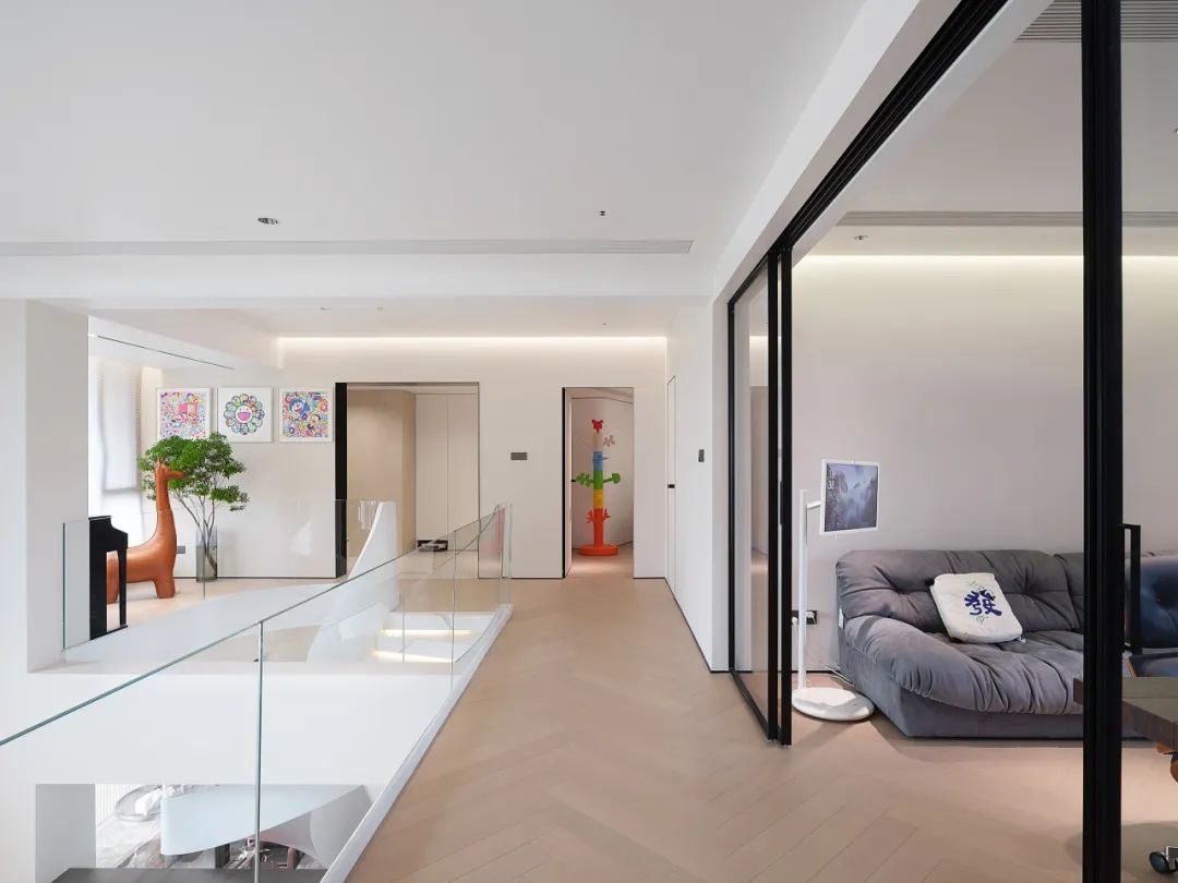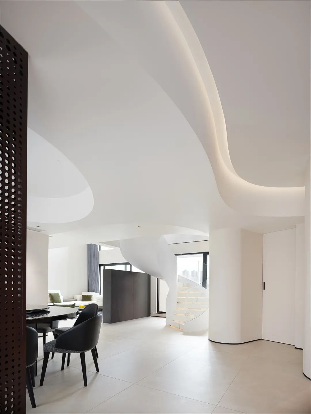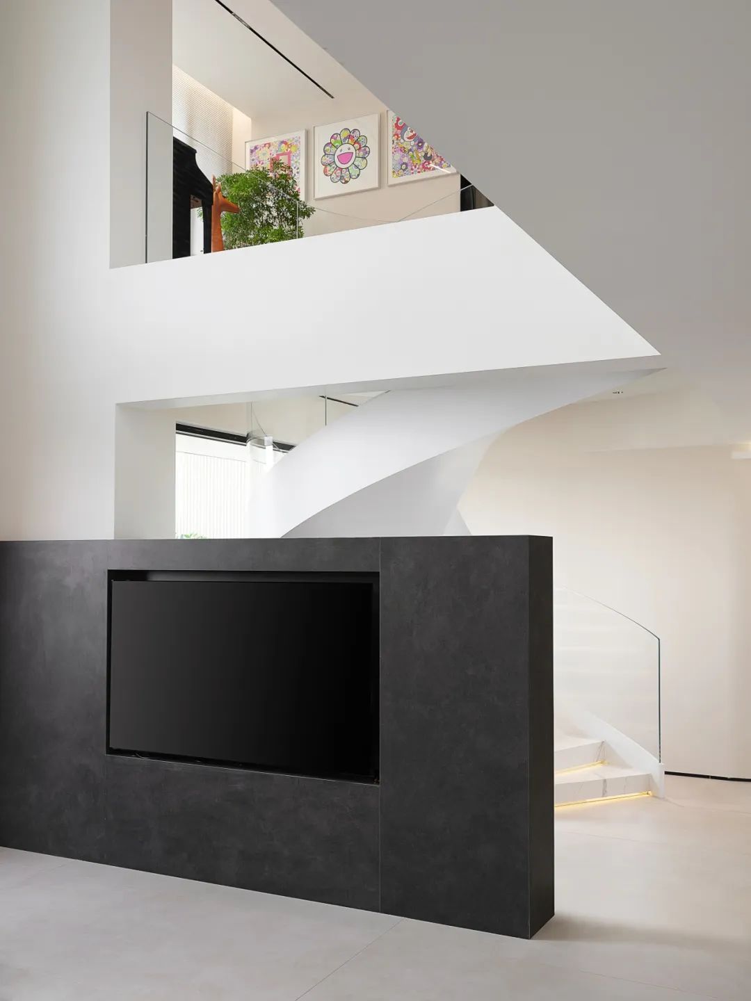 旋转楼梯作为连接上下层的过渡空间,采用透明玻璃扶手和纯白踏步设计,宛如一件精致的艺术装置。
