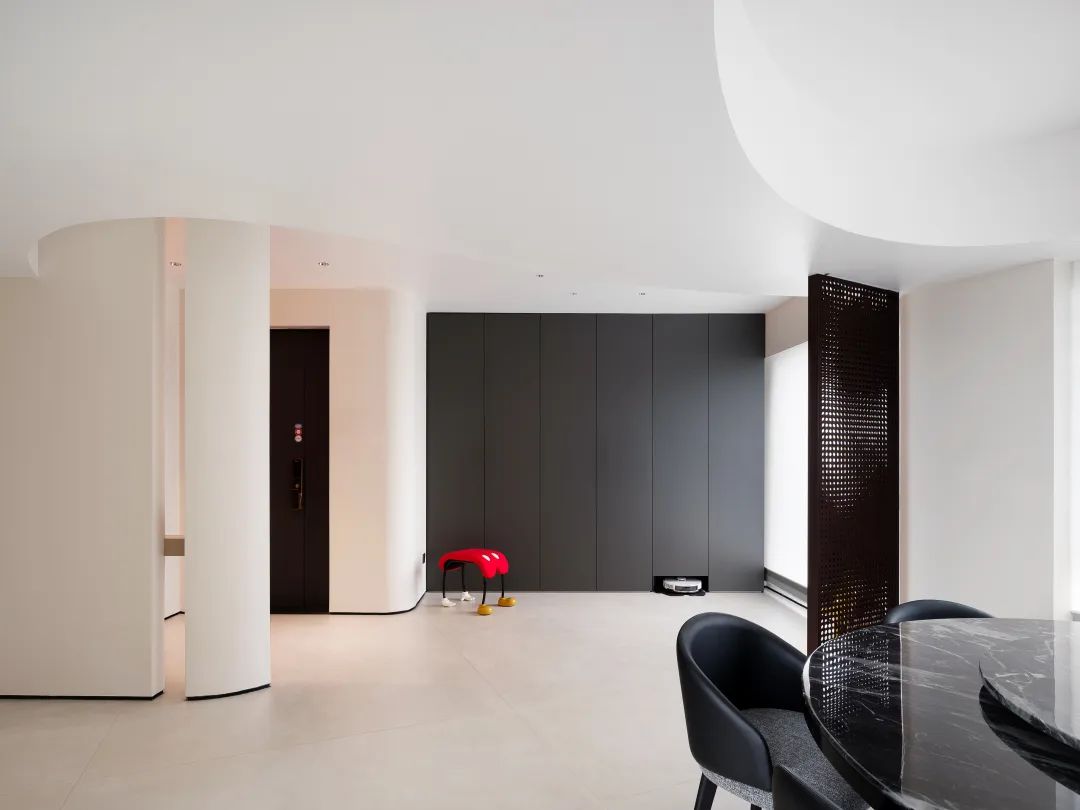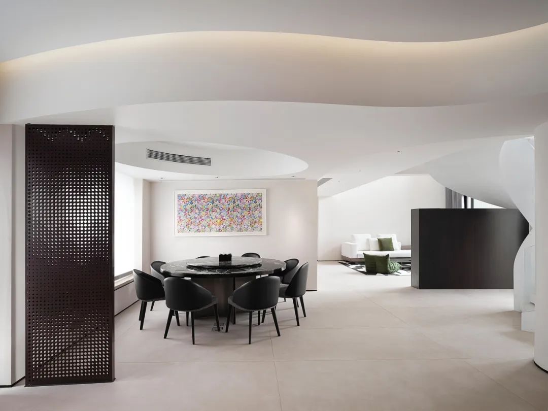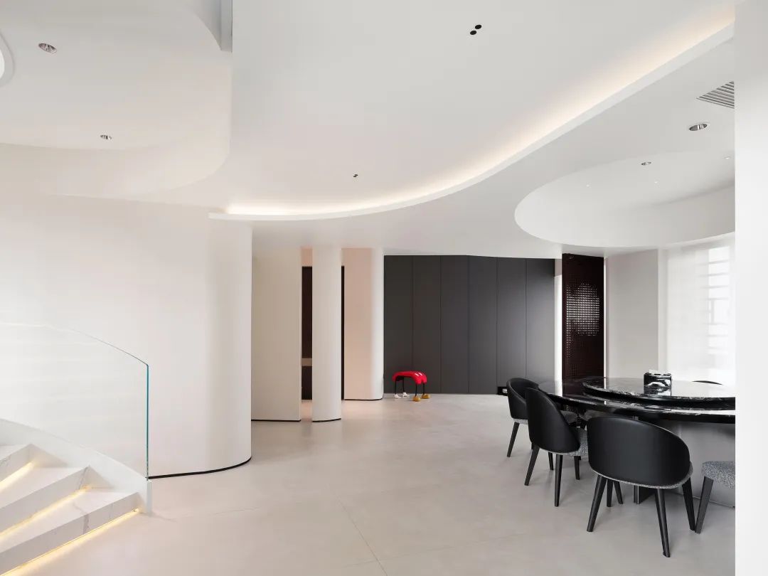 餐厅区域延续了整体空间的极简美学,采用悬浮式弧形吊顶设计,巧妙地弱化了原有横梁的压迫感。