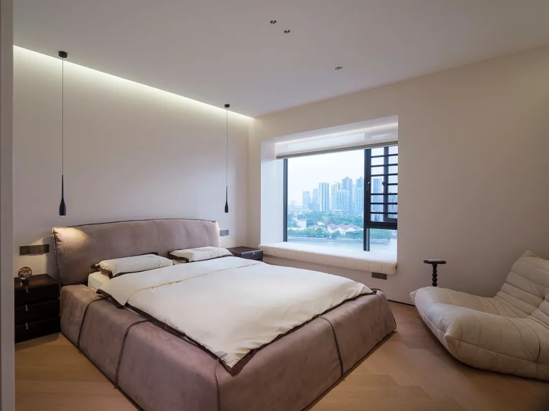 设计师拆除了原有阳台隔断,采用全景落地窗设计,将珠江日夜变幻的景色引入室内。这一设计不仅扩大了视觉空间,更让自然光充分洒入室内。