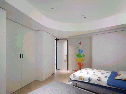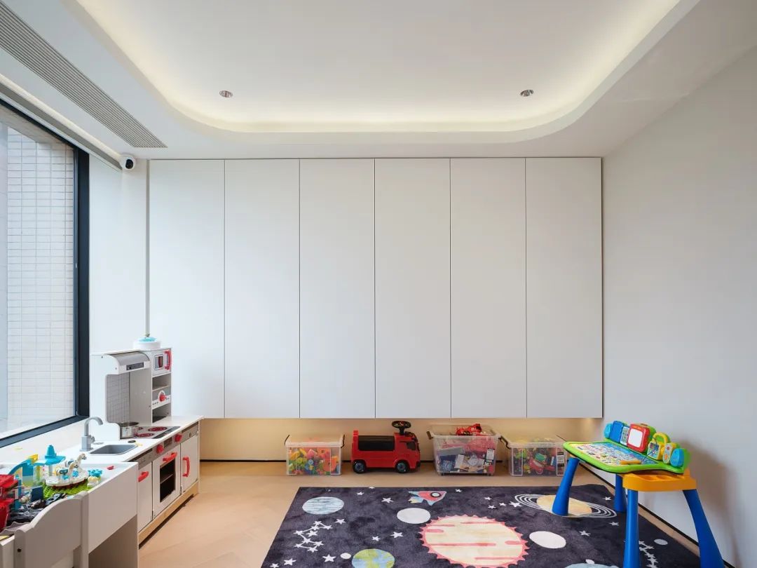 儿童房延用全屋白色基调,通过隐形移门的设计,将玩乐区巧妙地隐藏起来,保持空间的整洁感。
