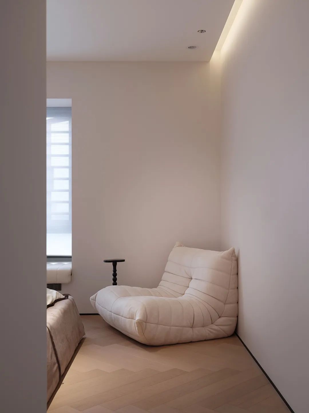 主卧咖色软包床、奶白色毛毛虫沙发,细腻的材质与柔和的配色,营造高级酒店般的舒适感。飘窗区域经过精心改造,加装记忆棉软垫,成为惬意的阅读休闲区。