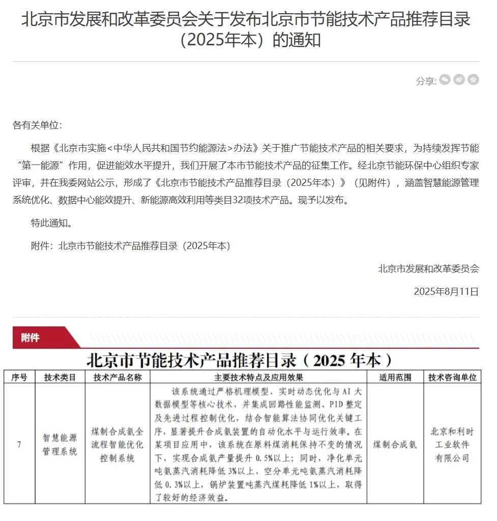 和利时“煤制合成氨全流程智能优化控制系统”入选《北京市节能技术产品推荐目录(2025年本)》