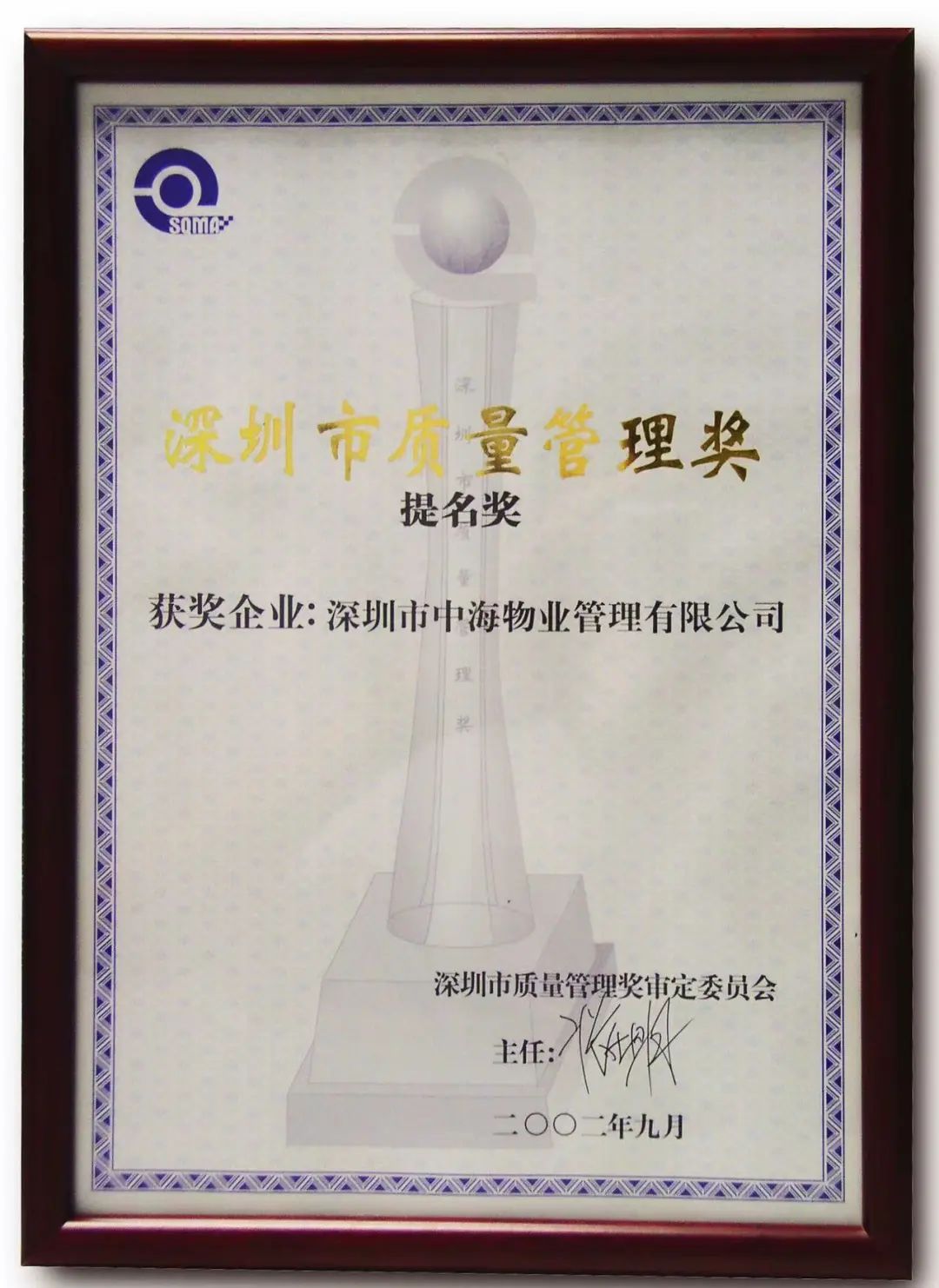 ∆2002年中海物业获评“深圳市质量管理奖”