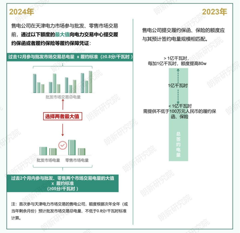 图片来源:《天津市售电公司履约保函及履约保险工作方案(2023年)》《天津市电力市场履约保障凭证工作方案(2024年修订版)》,“朗新研究院”编辑部整理