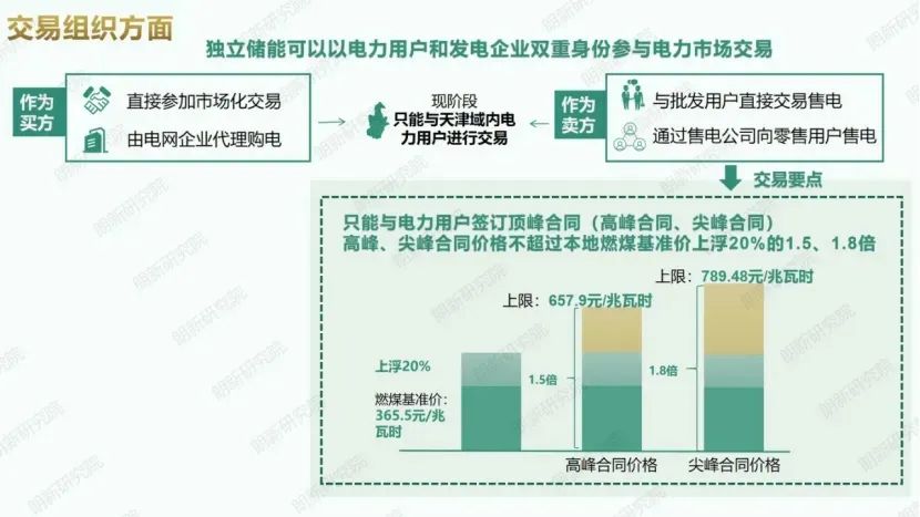 在交易组织方面,独立储能可以分别按照电力用户、发电企业两种市场主体类型与天津域内电力用户进行交易。值得注意的是,作为发电企业时,独立储能只能与电力用户签订高峰或尖峰合同,合同价格不能超过天津燃煤基准价上浮20%的1.5和1.8倍。
