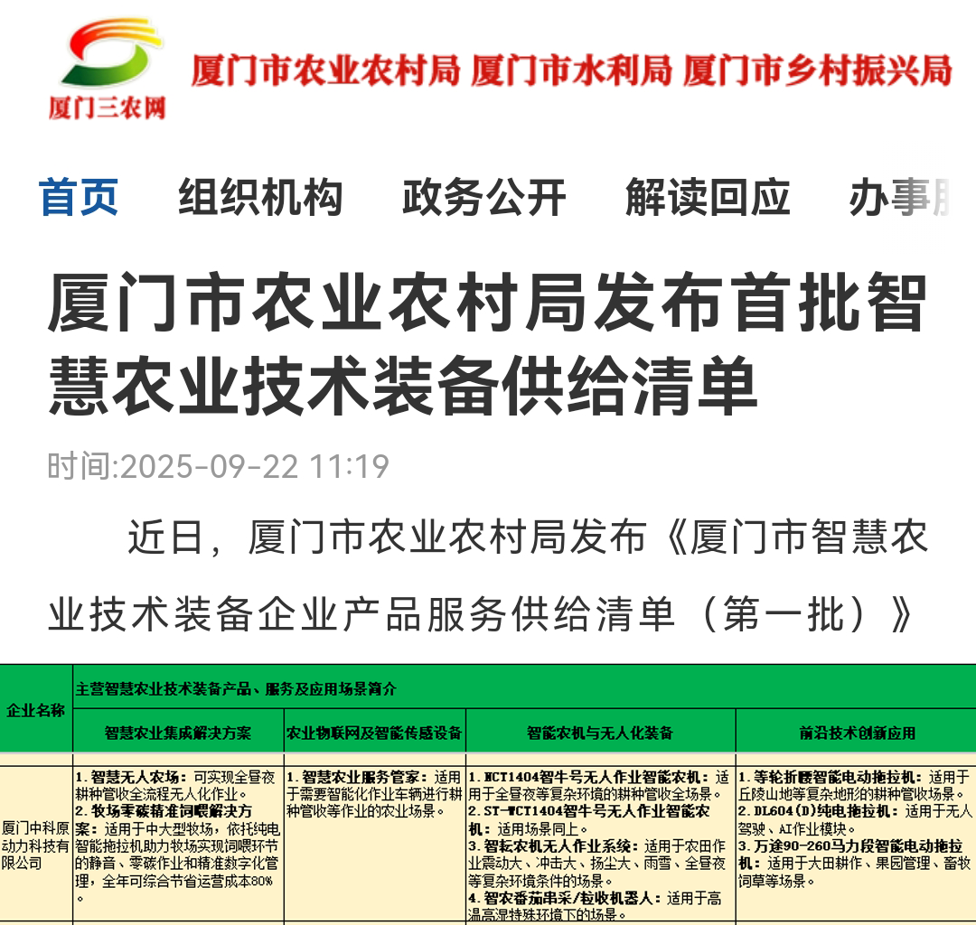 近日,厦门市农业农村局发布了《厦门市智慧农业技术装备企业产品服务供给清单(第一批)》(以下简称《清单》),积极推动智慧农业技术装备与农业经营主体的高效对接,加速农业数字化、智能化转型发展。中科原动力成功入选该《清单》,成为助力厦门智慧农业发展的重要力量。此次《清单》的编制与发布,是贯彻落实《农业农村部关于大力发展智慧农业的指导意见》和《全国智慧农业行动计划(2024 - 2028 年)》的关键举措。经过公开征集、企业申报以及材料审核等严格流程,共有本市及外地的 46 家智慧农业技术装备企业脱颖而出,入选首批供给清单。这些企业覆盖了智慧农业集成解决方案、农业物联网及智能传感设备、农业信息化平台与服务、智能农机与无人化装备、前沿技术创新应用等五大领域,涉及百余项产品与服务。中科原动力凭借自身在智慧农业领域的先进技术和优质服务成功入选,公司产品和服务有望为厦门市的农业经营主体带来新的发展机遇。《清单》的发布不仅有助于企业推广先进的产品和服务,更为家庭农场、农业企业、合作社等农业经营主体提供了一份实用的 “智慧农业技术装备选购指南”,使他们能够精准选择合适的技术装备,提升生产经营效率。厦门市农业农村局表示,下一步还将适时组织供需对接、场景开放和技术培训等活动,推动智慧农业技术装备的广泛应用与落地,为厦门市农业农村高质量发展注入数字新动能。中科原动力的入选,也将在这些活动中发挥积极作用,与其他企业一起为厦门智慧农业的发展贡献力量。编辑:张光辉