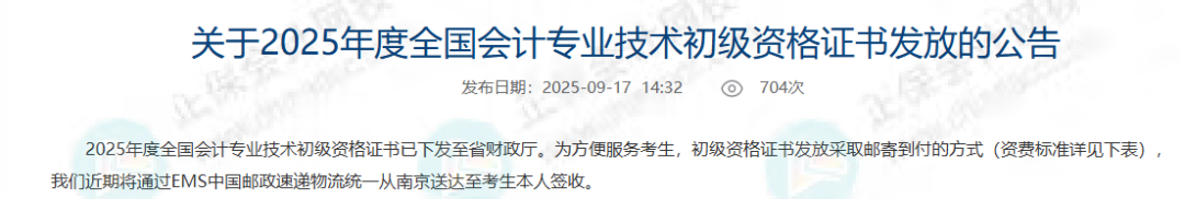 证书发放新消息?多地财政厅公布25年初级证书领取时间!