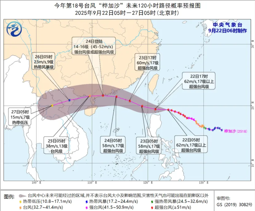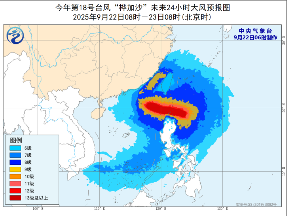 大风预报:22日8时至23日8时,巴士海峡、南海东北部海域、台湾海峡、台湾以东洋面、东海西南部海域、东沙群岛、福建沿海、台湾岛东南部沿海将有7~9级、阵风10~11级大风,其中,巴士海峡、南海东北部的部分海域风力有10~13级、阵风14~15级,台风中心经过的附近海域或地区风力可达14~17级、阵风17级以上。