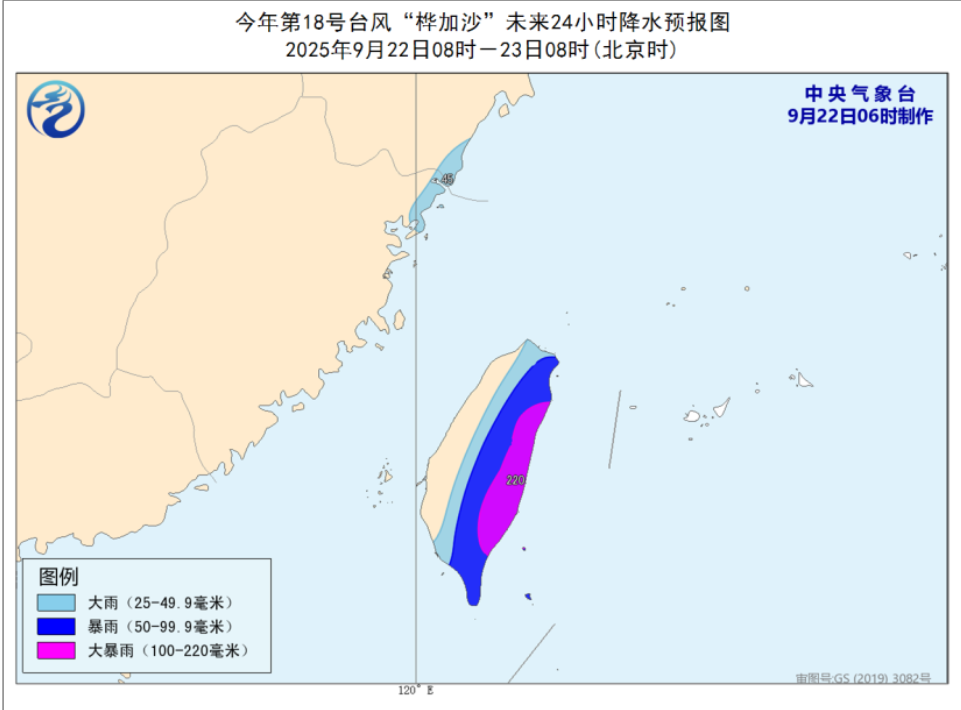 降水预报:22日8时至23日8时,福建东北部和浙江东南部局地有大雨,台湾岛中东部有大到暴雨,台湾岛东部的部分地区有大暴雨(100—220毫米)。