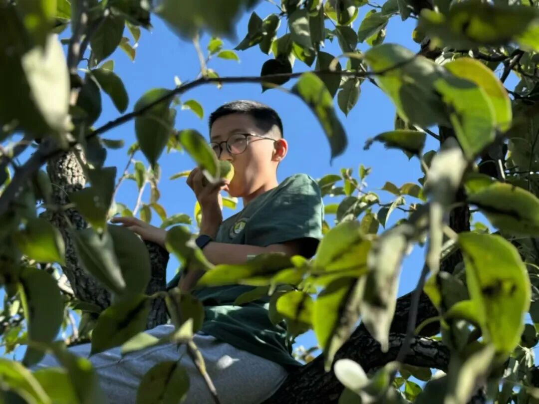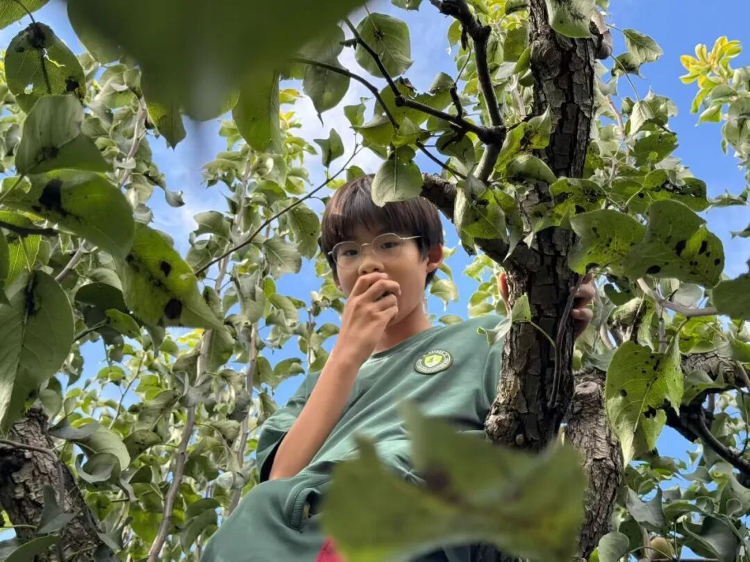 才发现藏着个小秘密:我们举着梨拍个不停时,老师镜头里的主角从不是满树果实——是追着梨跑的你,是蹲看落梨皱眉的你,是捧着梨笑出虎牙的你。原来我们眼里是梨,老师眼里全是“梨树下的你”~