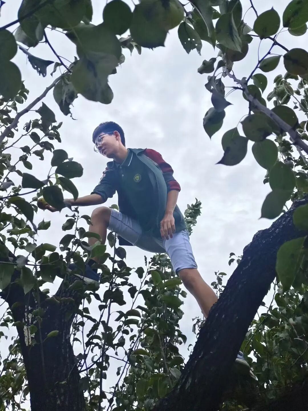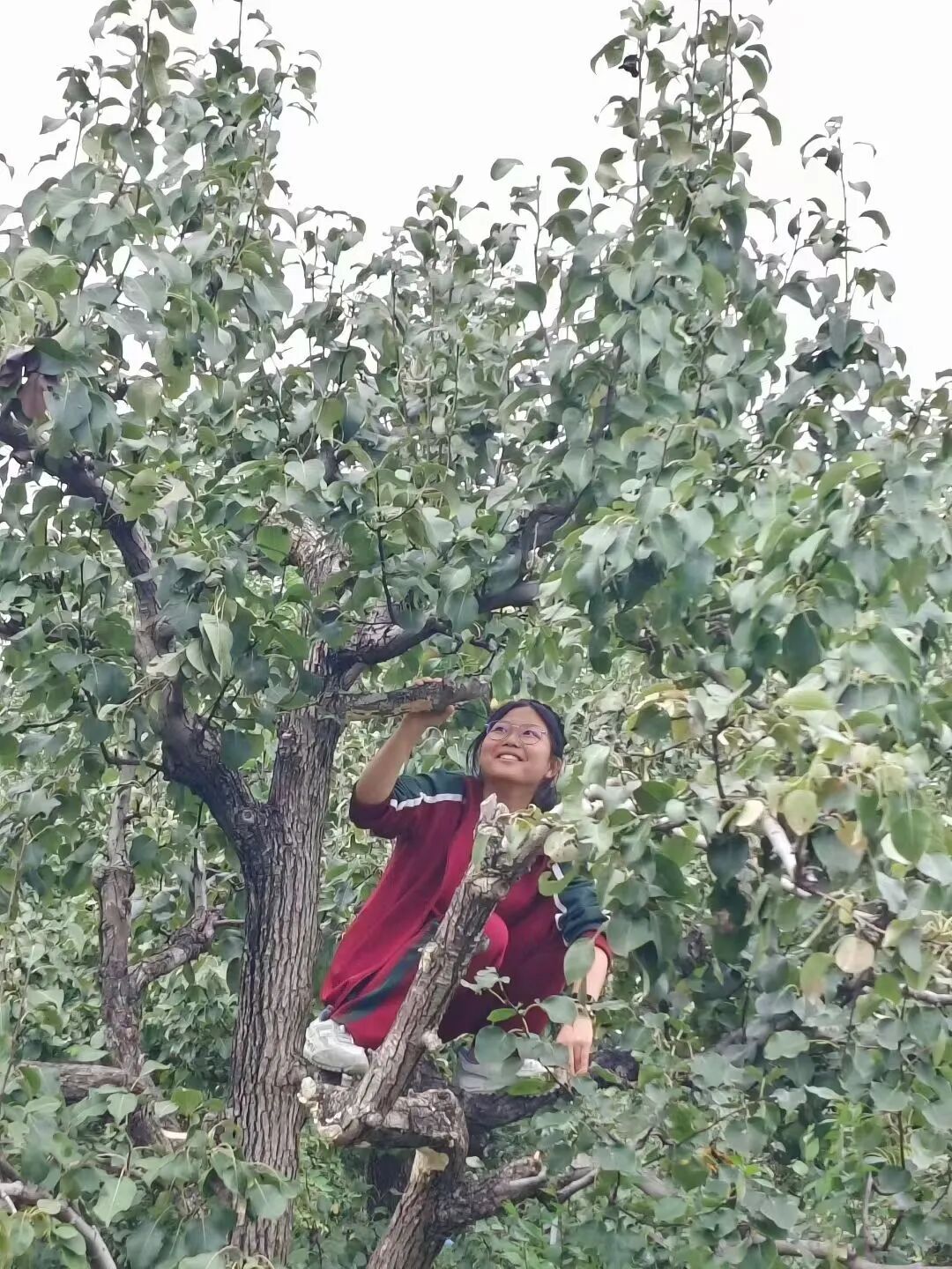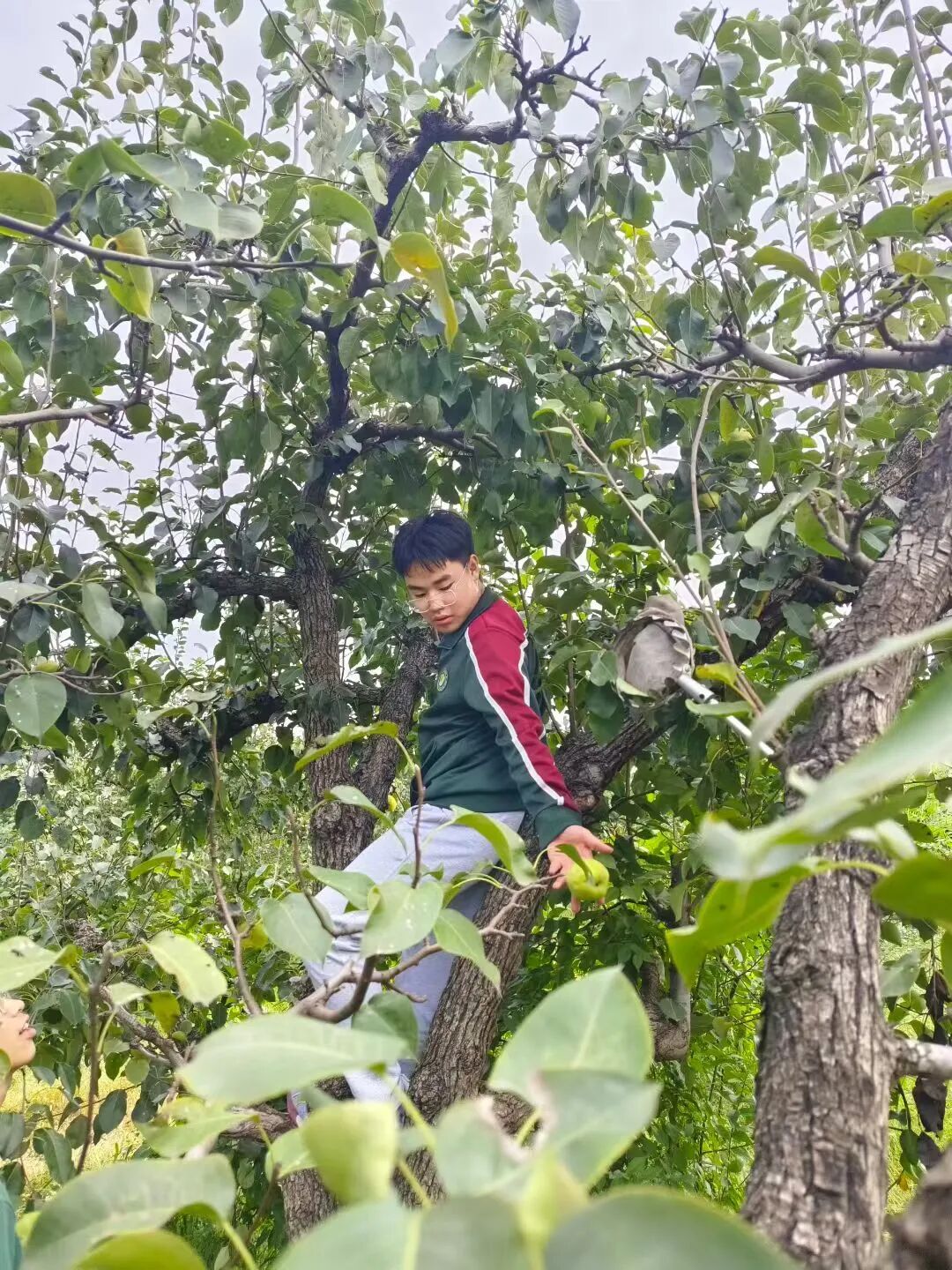 在这般美好的天气里,学长们穿着绿色和红色的上衣,有的挎着潮酷的篮子,有的干脆爬上树,有的伸手去摘树上的梨。摘下的梨有大有小,仿佛夜空中的星星,闪闪发亮。还有的同学捧着金黄的梨,果皮上点缀着细碎的斑纹,那清甜的香气仿佛已经飘进了心里,让人忍不住期待着清甜的味道。看到这一幕,我也想钻进图片中去尝一尝这个刚刚采摘的味道是什么样的。刚摘下来的梨新鲜无比,我也想去感受一下这个梨的清脆!