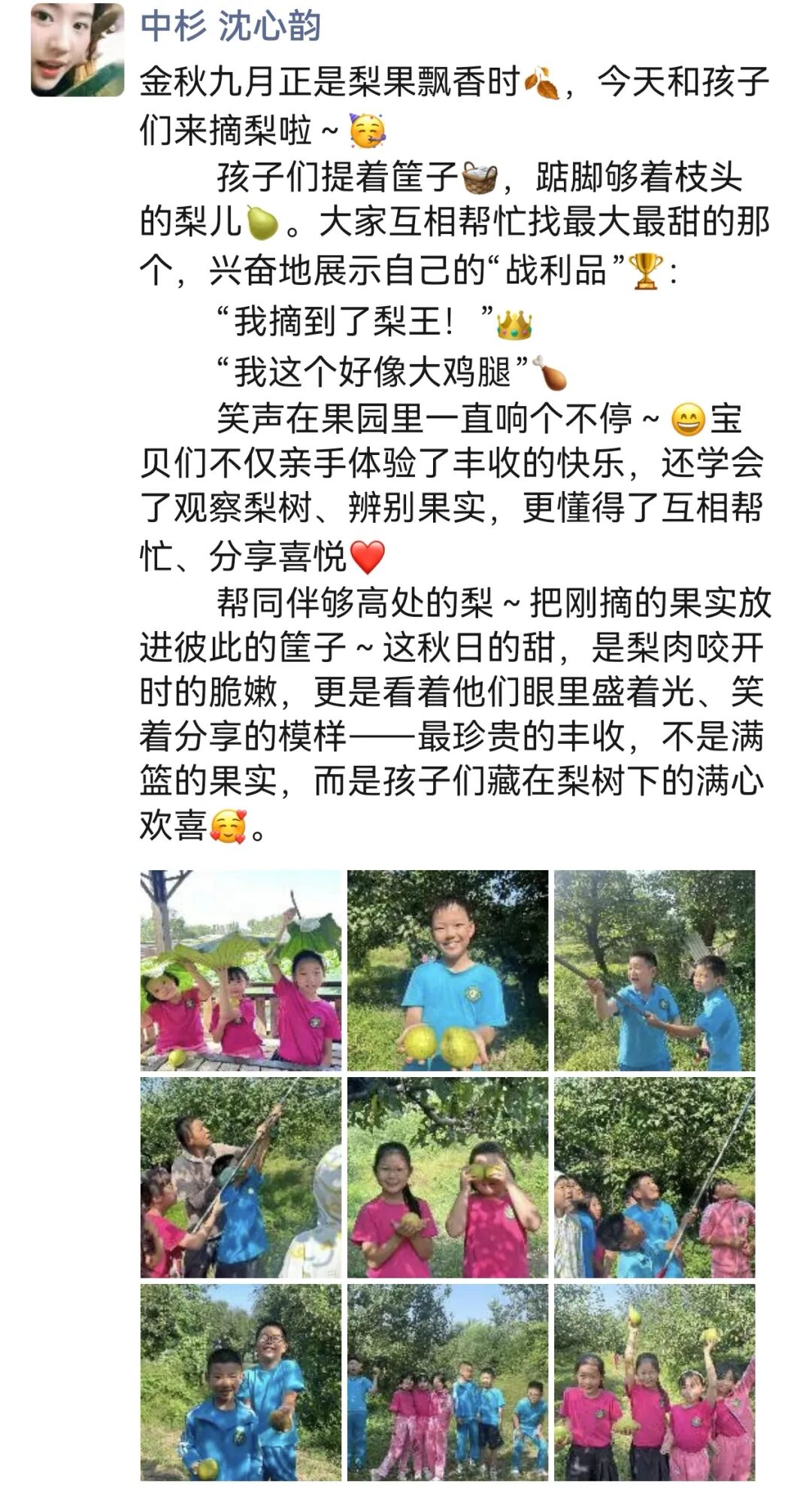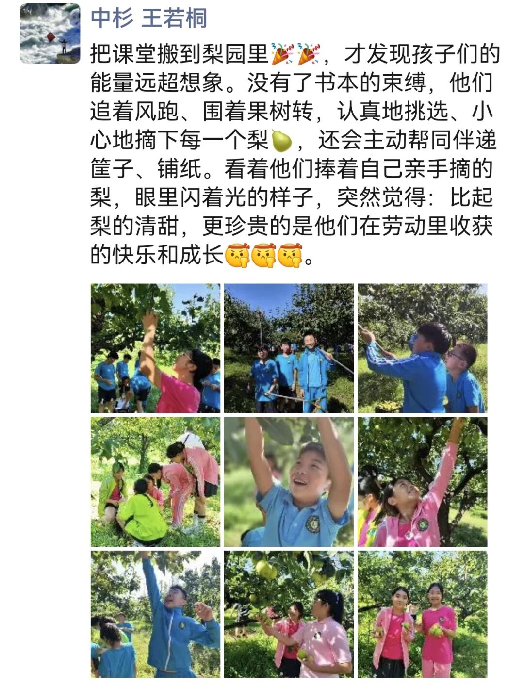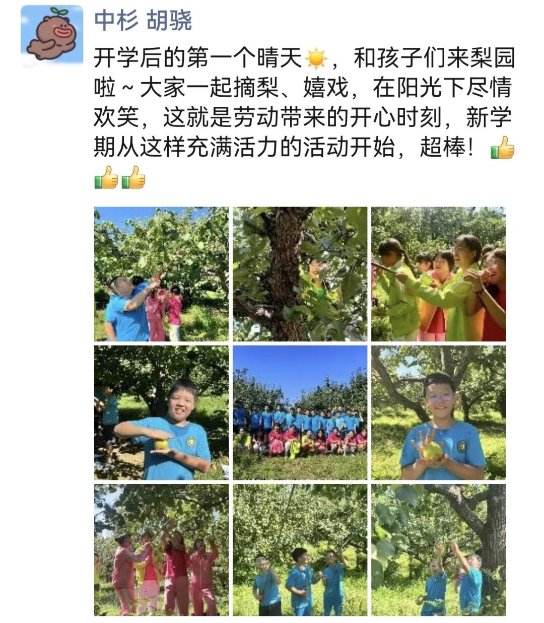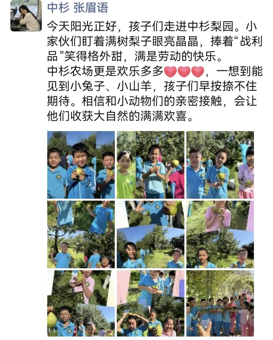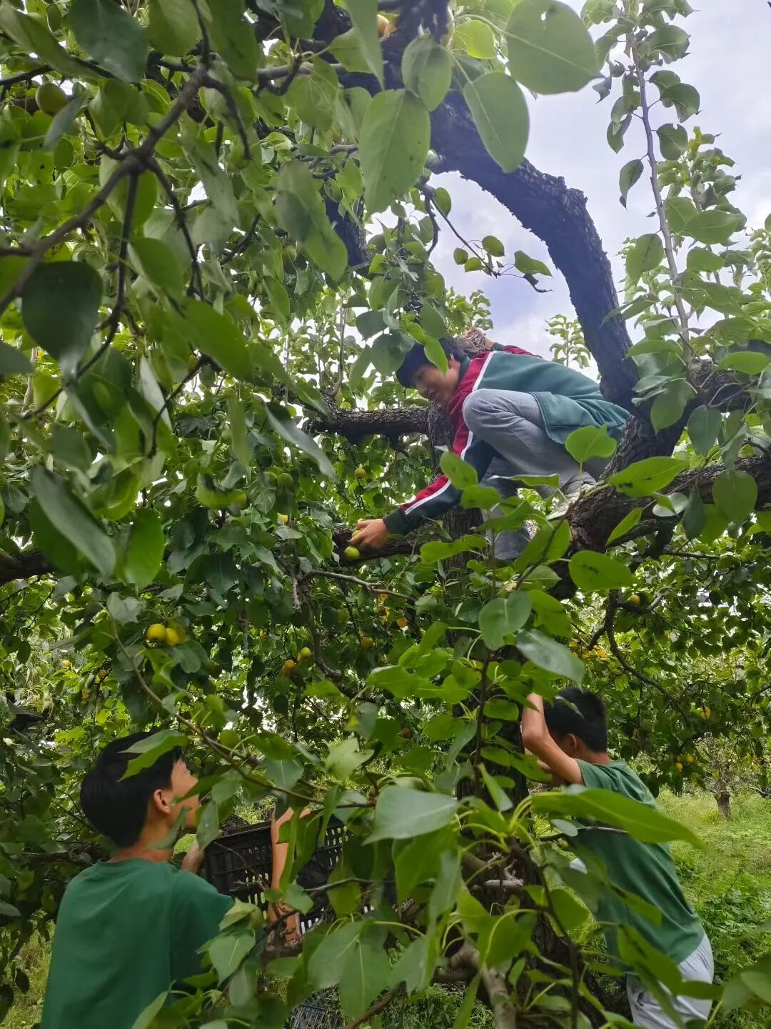 那真是一场欢快的摘梨体验!天是那么高,风是那么清爽,阳光洒在一个个正在摘梨的中杉学子身上,耳边还能听见云雀在歌唱。当我看见学长学姐在摘梨时,就也想去梨园摘一个又一个又大又圆的梨!