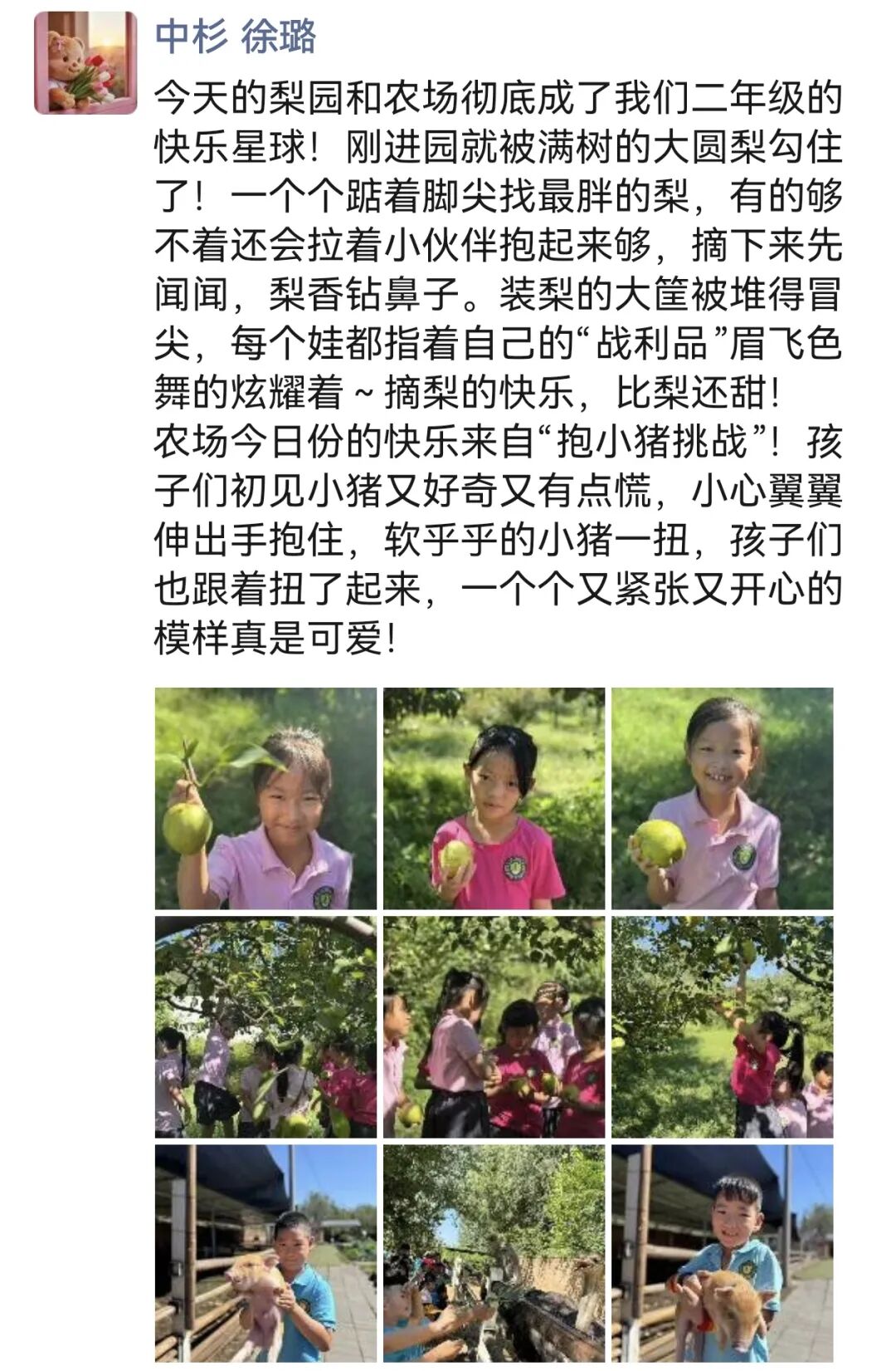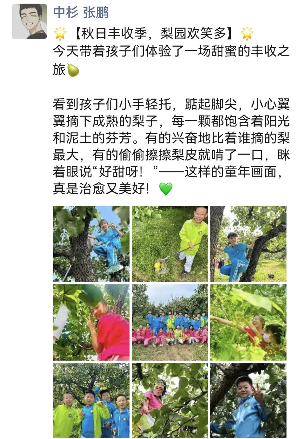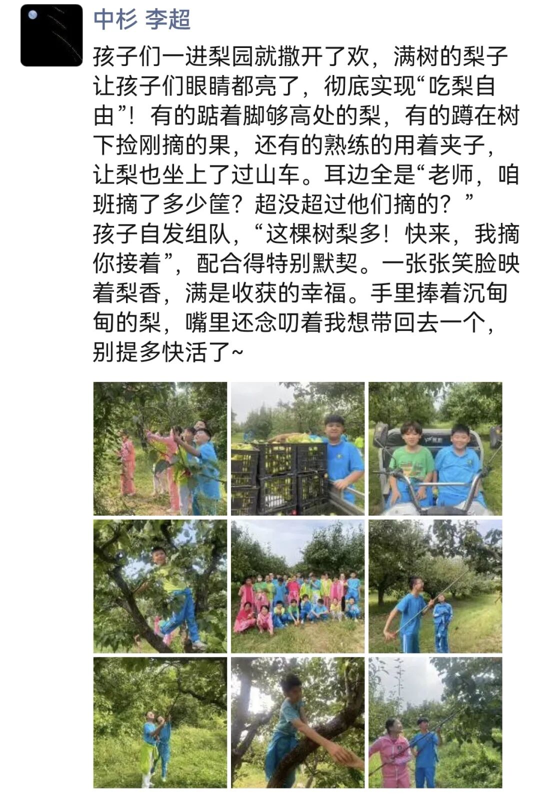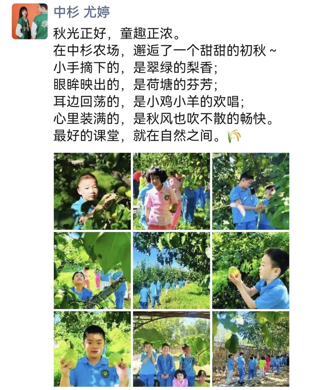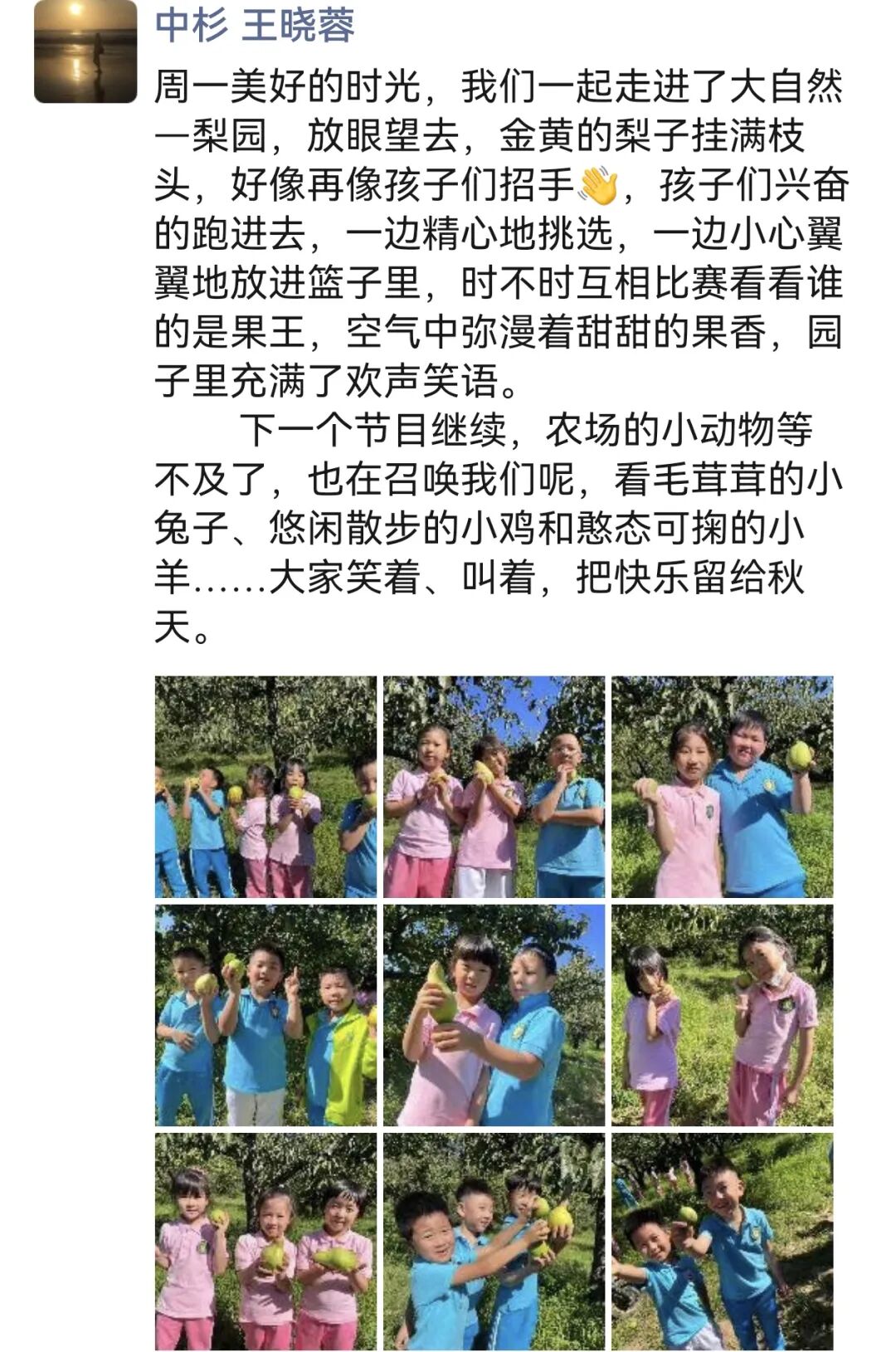 那真是一场欢快的摘梨体验!天是那么高,风是那么清爽,阳光洒在一个个正在摘梨的中杉学子身上,耳边还能听见云雀在歌唱。当我看见学长学姐在摘梨时,就也想去梨园摘一个又一个又大又圆的梨!