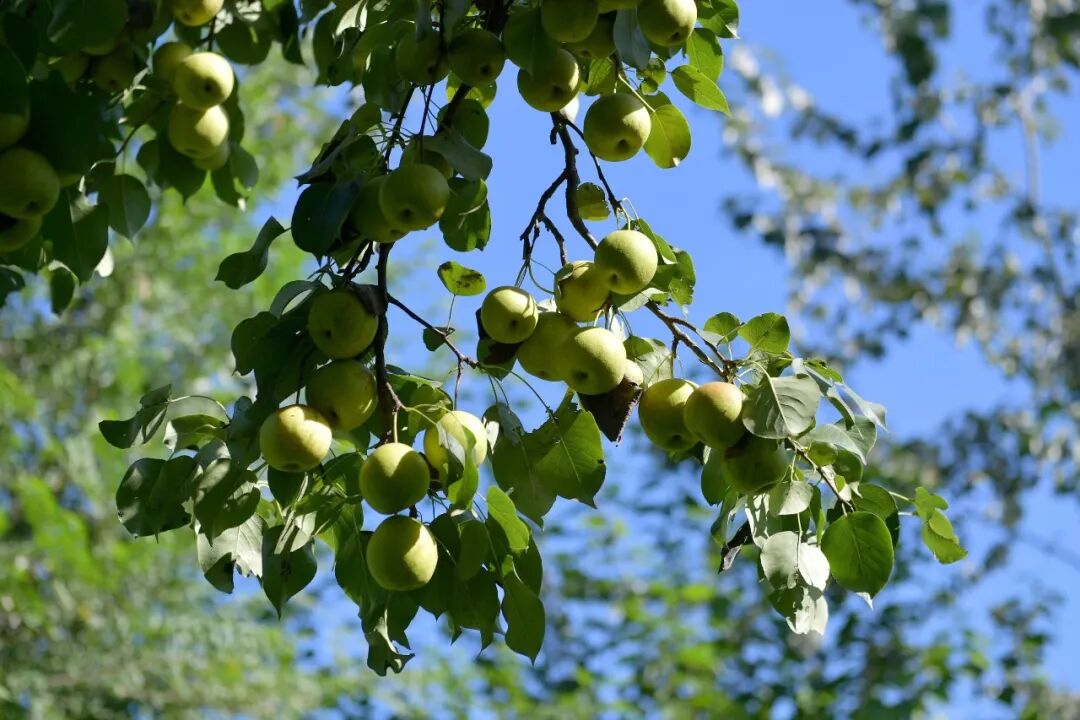 站在梨园边远远一望,枝头上全被沉甸甸的梨挤得满满当当。目之所及之处,全是圆滚滚的梨——树枝顶端挂着梨,枝干中间堆着梨,就连细细的侧枝上都坠着梨。把树妈妈的腰都压的更弯了。