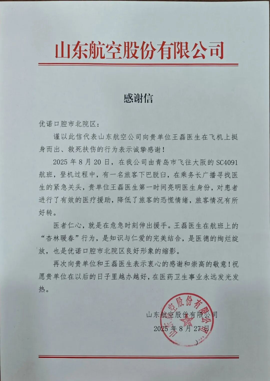 山东航空寄来的这封感谢信,字里行间满是诚挚的敬意。这不仅是对王磊医生个人善举的认可,更彰显出优诺口腔的人文温度与社会责任担当,是优诺口腔“向上、向善、向爱”精神的深刻见证。