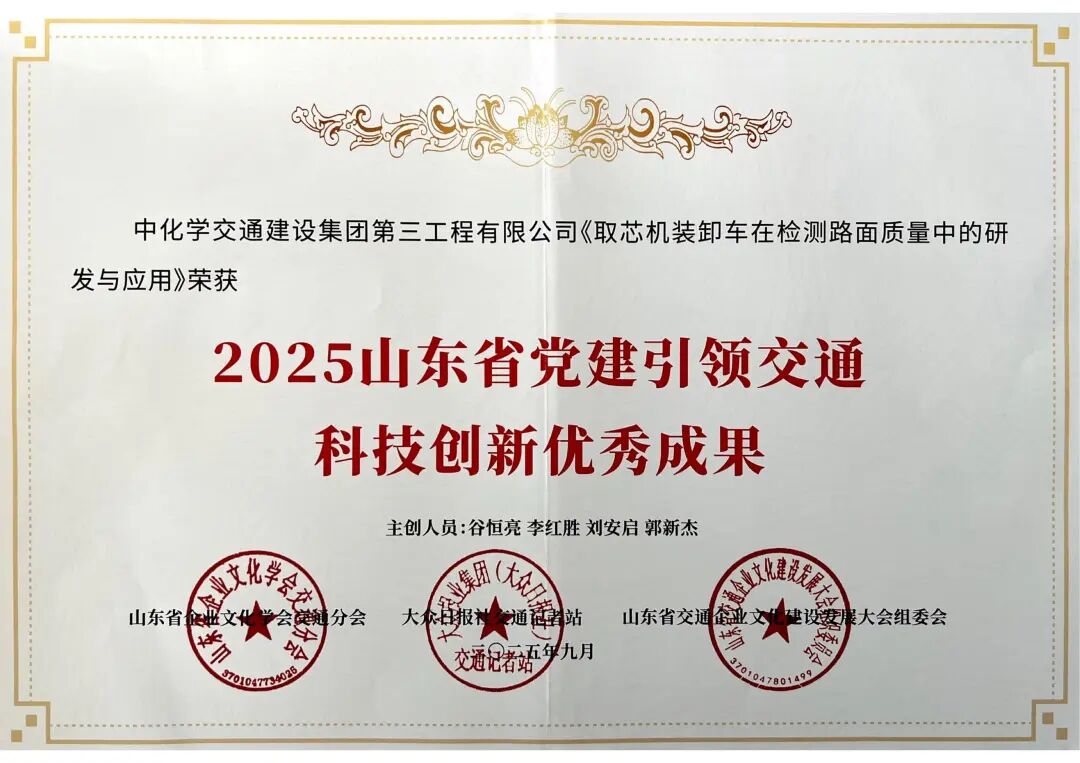 在党建引领企业文化建设优秀成果发布环节,第三工程公司荣获“2025山东省交通行业企业文化建设先进单位”“红色文化月”主题活动优秀单位等两个集体奖项,《取芯机装卸车在检测路面质量中的研发与应用》获评“2025山东省党建引领交通科技创新优秀成果”,多名同志获评先进个人。