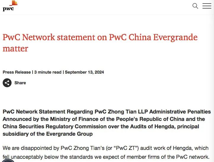 声明中,普华永道全球主席Mohamed Kande在评论此次事件时表示:“普华永道中天恒大地产审计团队所做的工作远低于我们的高预期,完全无法接受。它并不代表我们作为一个网络所代表的立场,普华永道没有这样的空间。因此,在进行彻底调查后,我们确保采取行动追究责任人的责任,并制定全面的补救计划,为未来打造更强大的普华永道中国业务。中国仍然是普华永道网络的重要组成部分,我对普华永道的合作伙伴和员工充满信心,我们将共同努力重建与利益相关者的信任。”