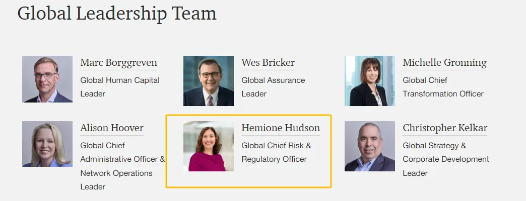 普华永道官网信息显示,何睦妮作为全球首席风险和监管官,是普华永道全球领导团队(Global Leadership Team)13名成员之一。自2016年进入英国公司管理委员会以来,她一直领导普华永道英国的鉴证和审计业务。她是英格兰和威尔士特许会计师协会(ICAEW)的会员,拥有超过25年的经验,专注于服务银行和更广泛的金融服务行业的审计和咨询客户。
