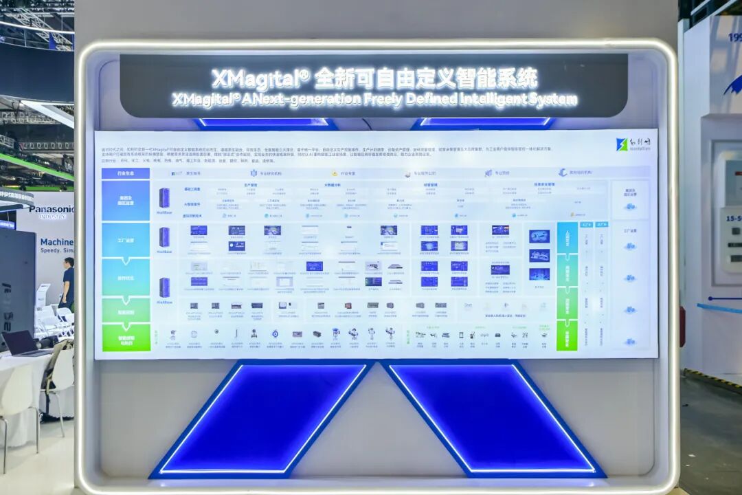 作为展台最大亮点,XMagital智能系统通过实时演示展现其生产控制与生产管理原生一体化的创新理念。参观者可通过交互界面体验五大应用集群的自由定义功能,包括生产控制操作、生产计划调度、设备资产管理、安环质量管理和经营决策管理。系统深度融合数字孪生技术,实时展示设备级到企业级的数据贯通与业务协同,彰显其打破传统分层架构的技术优势。