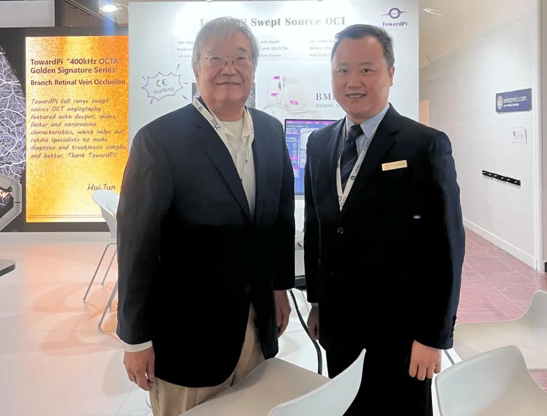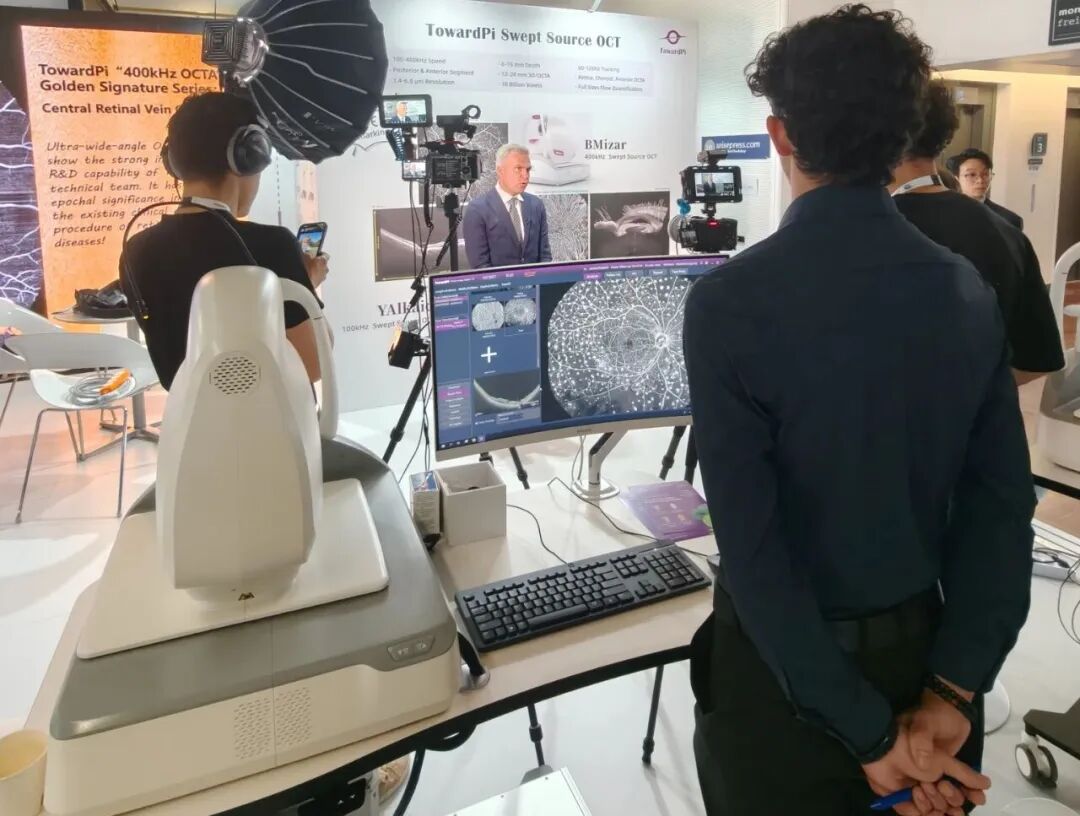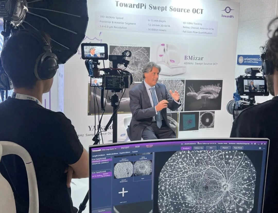 更有一众眼科届大咖纷纷莅临图湃展台,与图湃全球事务部副总周健先生探讨关于全新OCTA技术和未来眼科创新技术的发展。分享使用全新一代超广角全域扫频OCTA技术的感受及其在眼科临床及研究中的重要意义。