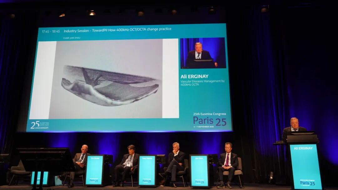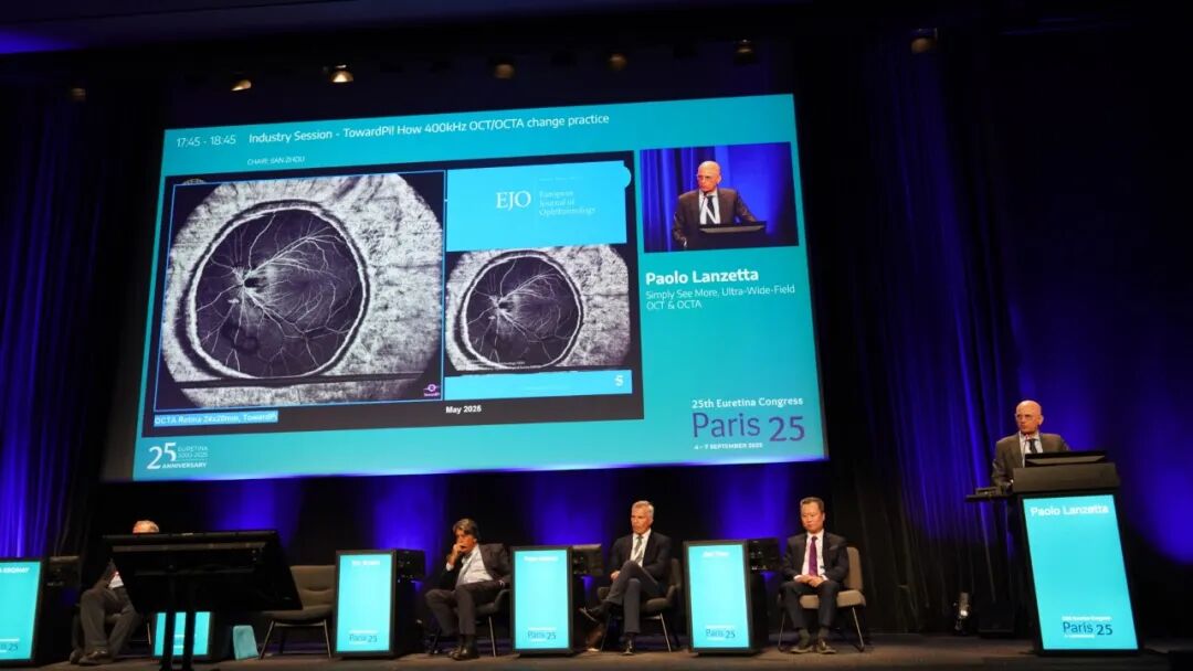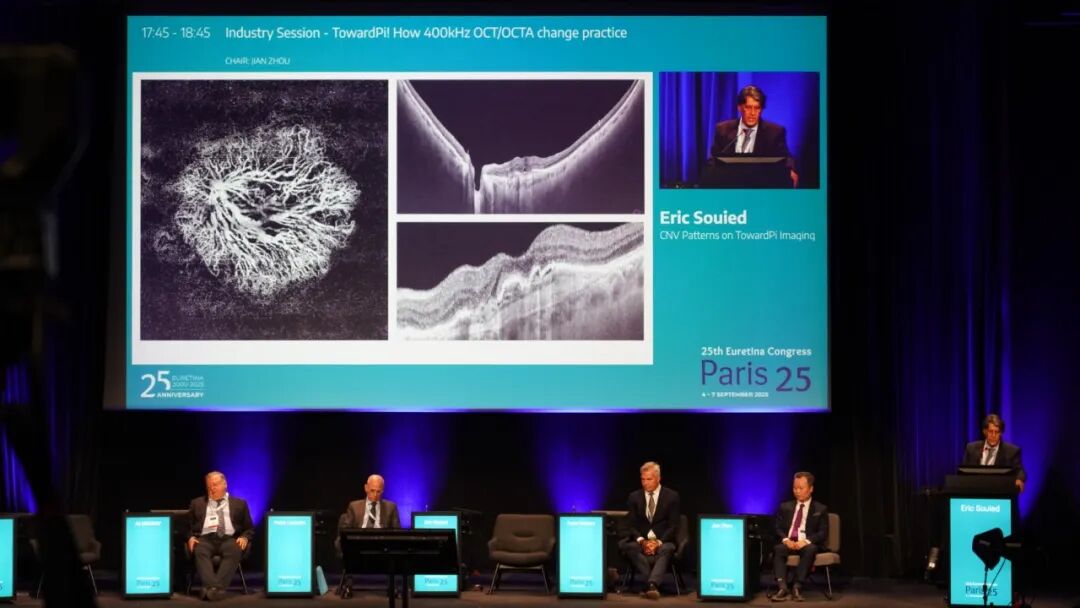 Peter Maloca教授通过对常见黄斑疾病的深入探索,抛出提问:我们真的认识到疾病的全貌了吗?只有通过超广角全域扫频OCTA才能在对后极部病灶明察秋毫的同时,不遗漏周边视网膜的改变,赞叹图湃超广角全域扫频OCTA以及强大的前后节3D成像,让眼科医生有了探索更多未知的可能;Eric Souied教授详尽分享了各型CNV及RVO的精美OCTA图像,即使PED高度超过250um也能清晰呈现CNV血管细节,3D OCTA对PCV乃至息肉内血管细节的重建更令人叹为观止,Souied教授盛赞图湃OCT是对眼科成像极限的突破;Paolo Lanzetta教授则直观对比了超广角全域扫频OCTA和传统经典老牌扫频OCT,无论是成像分辨率、扫描范围还是一系列量化分析功能,超广角全域扫频OCTA都无疑是眼科OCT技术有史以来的重大革新;Ali Erginay教授更是通过对视网膜脉络膜血管性疾病的深入研究,展示了图湃在脉络膜血管成像上取得的重要成就,以及超广角量化、3D OCTA重建,和前节OCTA功能等巨大优势,直言图湃全域扫频技术让眼科医生对眼睛的探索才刚刚开始。