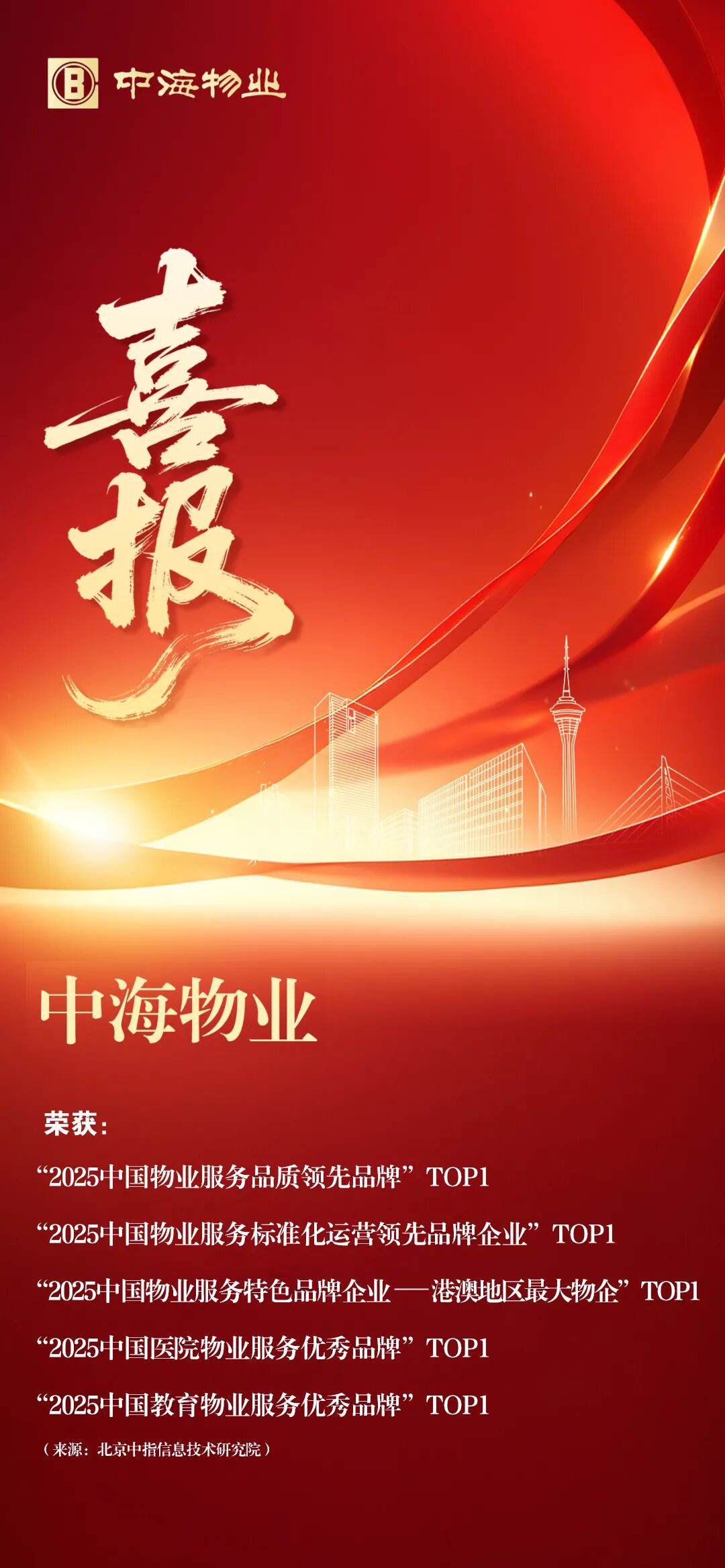 近日,由中国企业评价协会、清华大学房地产研究所、北京中指信息技术研究院主办,北京中指信息技术研究院中国房地产TOP10研究组承办的“2025中国房地产品牌价值研究成果发布会暨第二十二届中国房地产品牌发展高峰论坛”在北京举行。中海物业荣获多项殊荣,体现行业和市场对公司服务品质与品牌价值的充分认可。