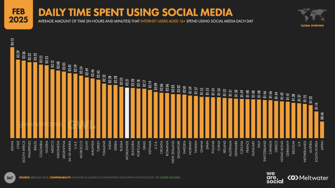 拉美Z世代的数字生活充满活力。根据We Are Social & Meltwater《Digital 2025 Global Overview Report》数据,拉美地区的社交媒体渗透率超过78%,其中Z世代的智能手机使用率接近100%。他们平均每天花费3小时以上在社交媒体上,远高于全球平均的2小时21分钟。智利、巴西、哥伦比亚、墨西哥、阿根廷位列全球社交媒体使用时长Top 10。
