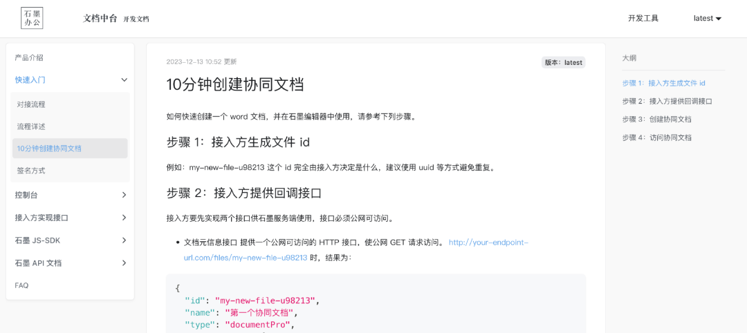若企业希望通过在线模式接入石墨文档中台,只需访问石墨文档「开放服务平台」,按以下步骤操作即可快速落地: