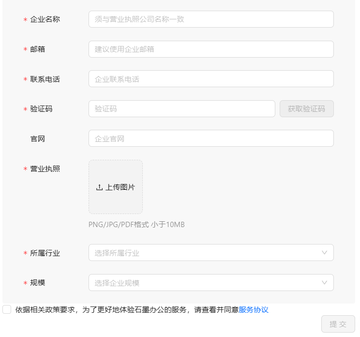 第一步:完成注册认证。在石墨「开放服务平台」注册账号,提交企业基础信息后,提交系统审核认证。