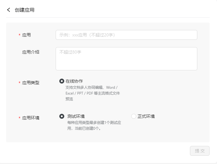 第二步:创建测试应用。您可在此体验文档中台的接入与应用实现,快速验证功能适配性。创建和使用测试应用无需付费,仅用于调试和体验,测试应用可接入用户数为10人,并将在创建1个月后下线并删除数据。