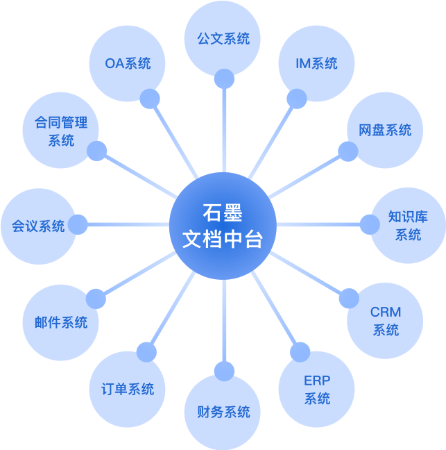 与私有化部署的文档中台一样,无论是企业日常办公的 OA 系统、即时沟通的 IM 工具,还是知识沉淀的企业云盘或知识库,通过「开放服务平台」接入的石墨文档中台都能无缝融入业务系统,企业可根据业务场景灵活选择需要接入的应用和能力。