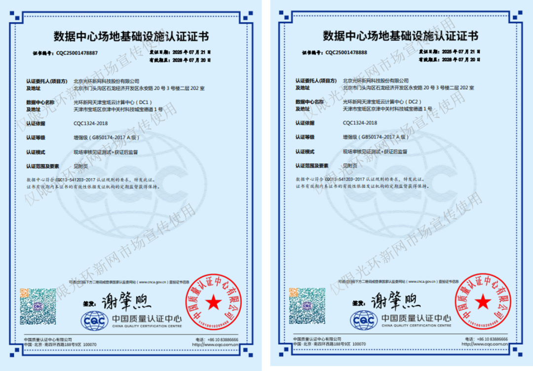 经过行业专家严格的综合评定,光环新网天津宝坻云计算中心DC1和DC2相继获得中国质量认证中心(CQC)颁发的《数据中心场地基础设施认证证书》,认证等级为国标最高等级的增强级A级。(GB50174-2017 A级)