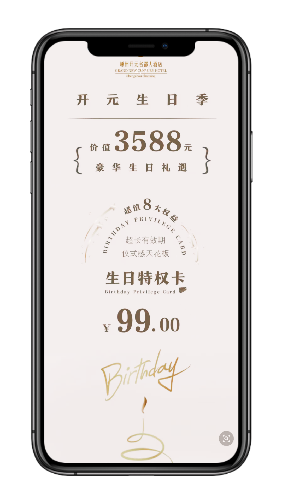 据吕刚先生介绍,生日卡由集团金总牵头设计,每家单店可结合自身特色定制权益:嵊州开元名都的生日卡不仅包含主题布置,以及红酒、菜品、司仪、礼金券等,还叠加了早餐、游泳等服务,实现 “全场景消费体验”;更有集团专属的 “王炸礼遇”—— 客人持生日卡消费达标后,可免费兑换海南棋子湾开元度假村的特权房型。