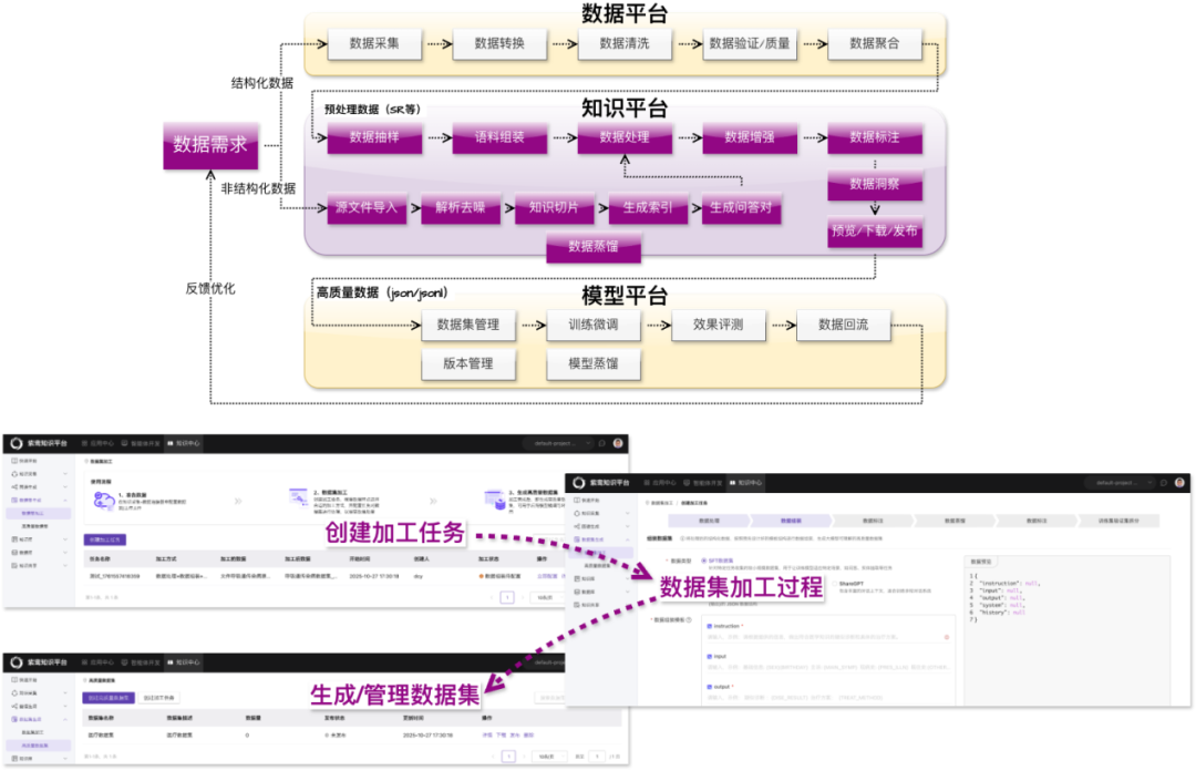 知识平台在功能上类似RAG知识库系统,支持对结构化和非结构化知识的统一管理与查询;同时更进一步,核心突破在于支持将管理的多源知识自动加工为高质量训练数据集: