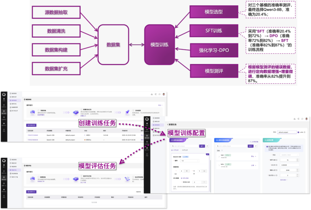 SFT 监督微调:平台支持主流开源大模型,提供可视化的参数配置界面,内置经过大量实践验证的训练参数模板,大幅降低训练门槛。实战中我们使用经知识平台制备的高质量数据集进行初步训练,准确率从20.4%提升至72%。