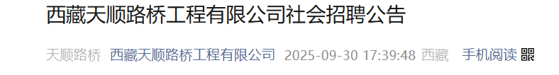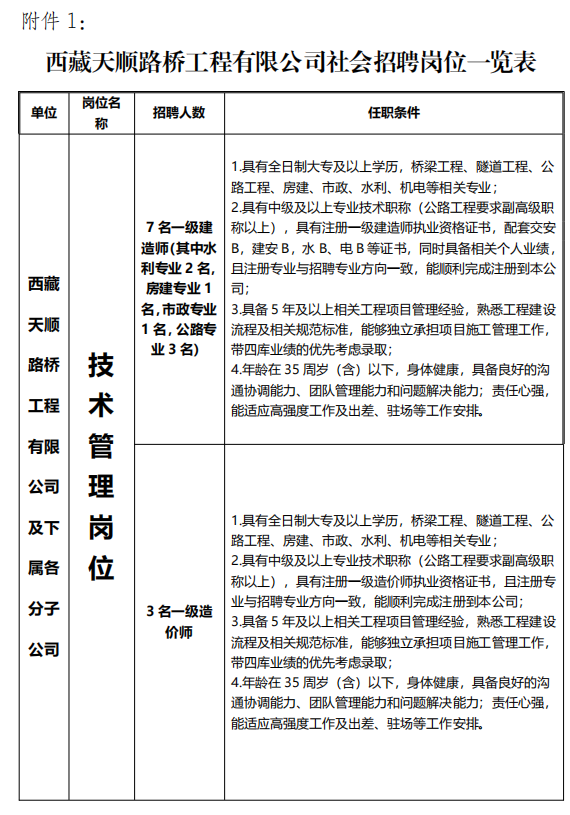 本次面向社会公开招聘10个岗位,共10人。招聘岗位职责及任职条件详见附件1《西藏天顺路桥工程有限公司社会招聘岗位一览表》。