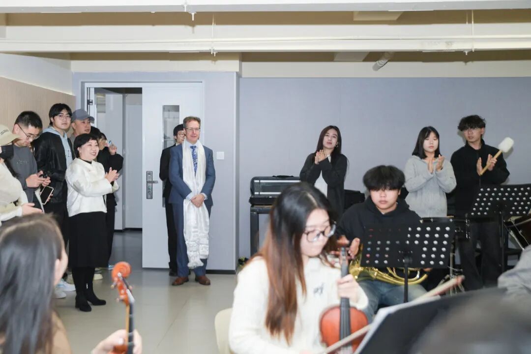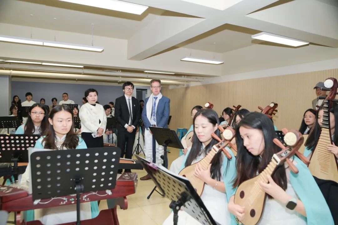 随后,艺术学院、国际学院相关负责人陪同卢克·多尔曼教授实地参观了学校艺术学院的各类实训室,现场观摩艺术学院管乐团、民乐团、合唱团及流行乐团的排练过程,详细了解学院实践教学的开展情况。多样化的艺术教学形式与学生们昂扬的精神风貌,给卢克·多尔曼教授留下了深刻印象。