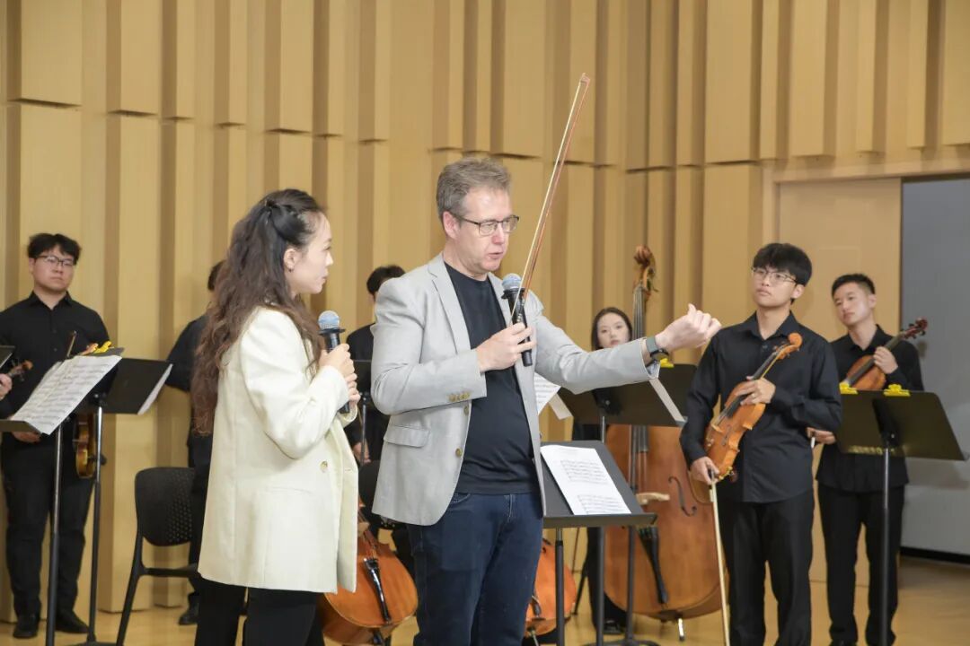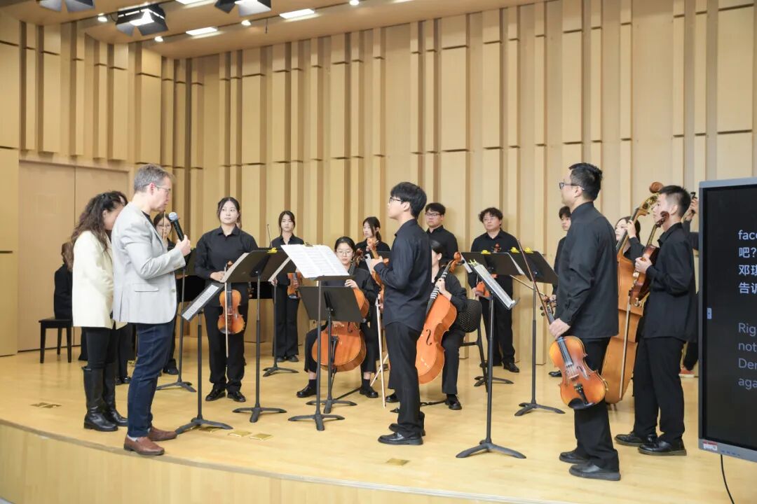 10月24日下午,卢克·多尔曼教授为艺术学院学生亲授大师课。课堂上,卢克·多尔曼教授以实践教学为主,结合自身演奏经验,针对学生基础问题逐一示范讲解。针对大提琴手持琴姿势僵硬的问题,他俯身调整琴身角度,强调“琴身需贴紧身体,通过肩颈自然支撑,让琴箱与演奏者呼吸同频”;对小提琴初学者运弓不稳的情况,他执琴示范“弓速与压力需均衡,弓毛轻贴弦面,声音才会干净通透”。课程持续2小时,学生们跟随卢克·多尔曼教授从基础姿势到细节处理逐步打磨技艺。课后,台上学生坦言:“以前只知道练琴,今天才明白‘听琴’同样关键——老师教我们感受琴箱的震动,调整手法让声音更‘活’。”