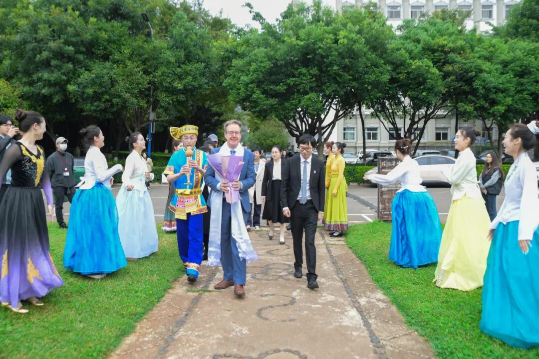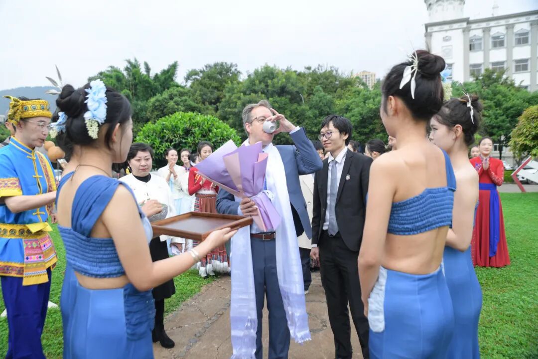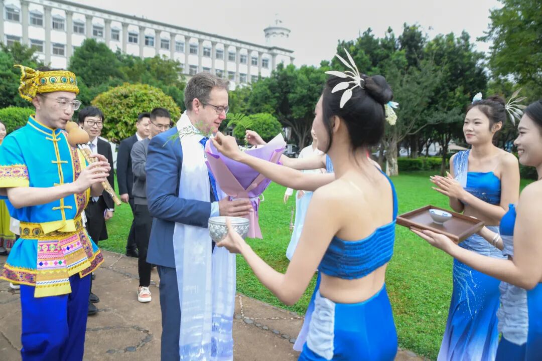 20余名学生身着民族服饰列队欢迎,学生身着傣族绣花筒裙,向卢克·多尔曼教授洒清水致祝福,学生代表向教授献花,现场氛围热烈。卢克·多尔曼接过鲜花并与学生交流,对特色欢迎表示感谢。